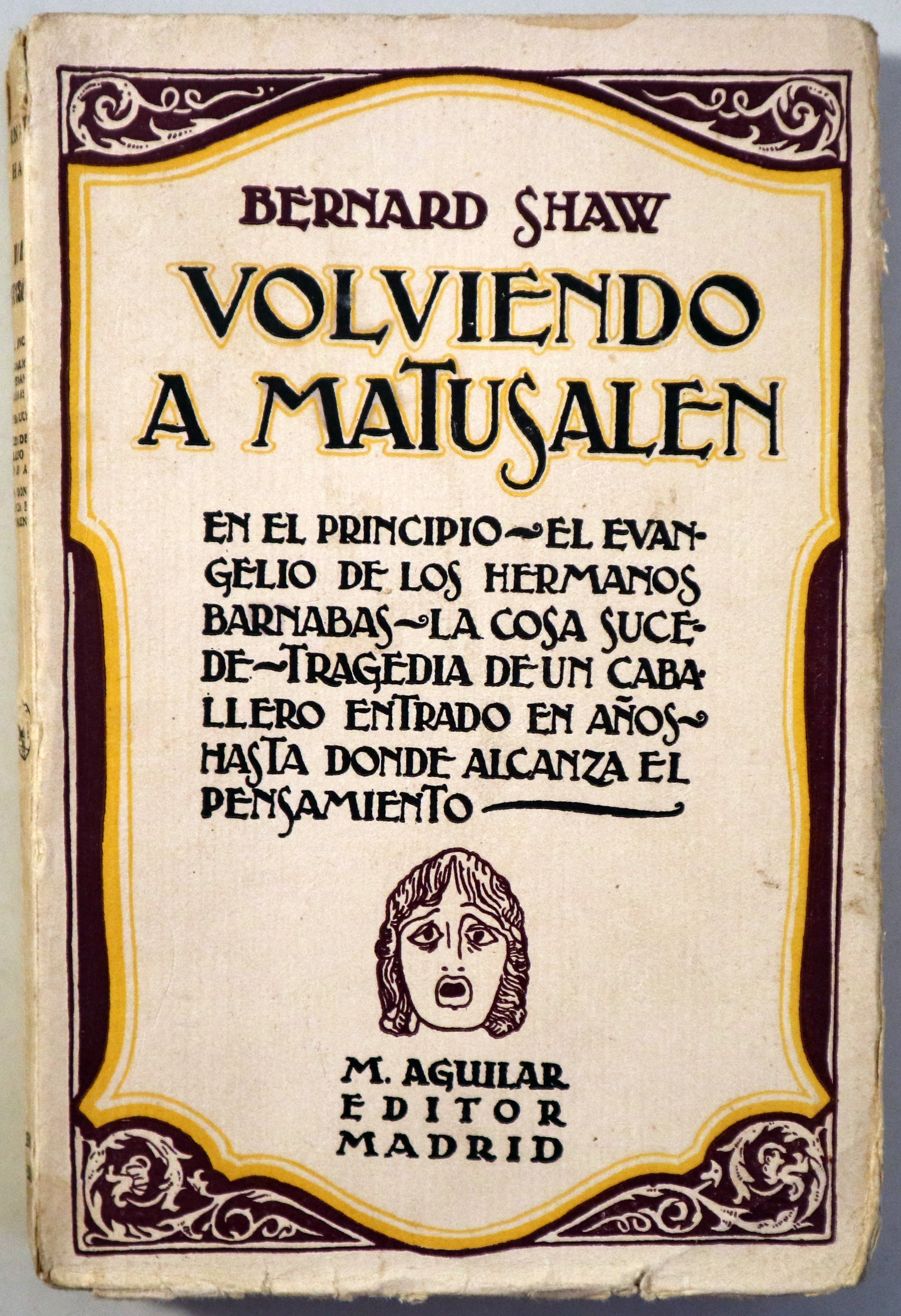 Madrid, M. Aguilar, s/f. Volviendo a Matusalen. Un Pentatéuco metabiológico. En el principio. El evangelio de los hermanos Barnabas. La cosa sucede. La tragedia de un caballero entrado en años. Hasta donde alcanza el pensamiento. Traducción de Julio Broutá. 422 p. 8º. Rústica editorial ilustrada. Inscripción del antiguo propietario.Algunas manchas de óxido. Levemente rozada. Buen ejemplar. 1ª edición. 1st edition.