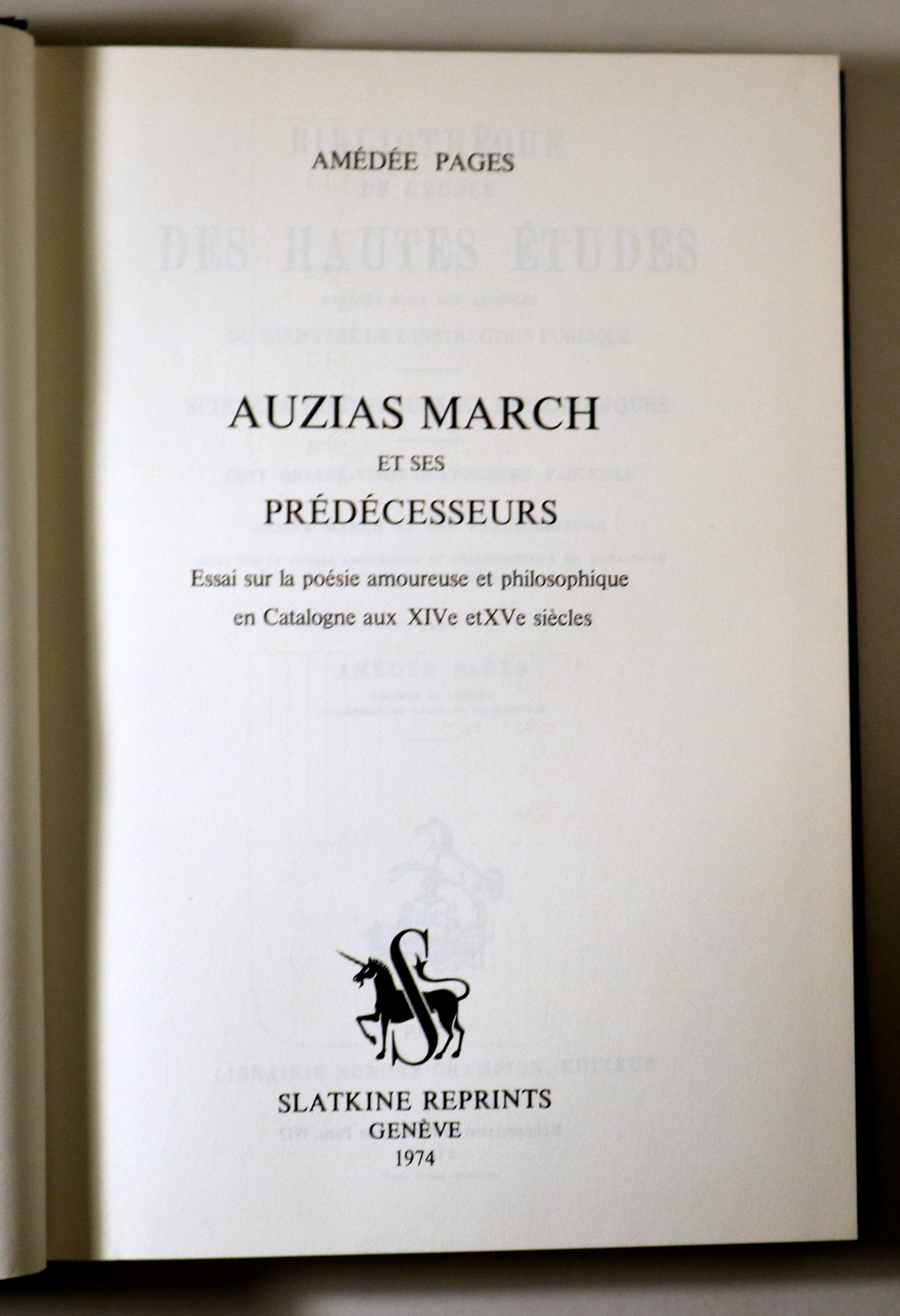 Genève, Slatkine Reprints, 1974. facsímil del 1912. Auzias March et ses prédécesseurs, essai sur la poésie amoureuse et philosophique en Catalogne. 469p. 4º mayor. Guaflex. Corte en el lomo. Lomo con tejuelo. Texte en français. Buen ejemplar.