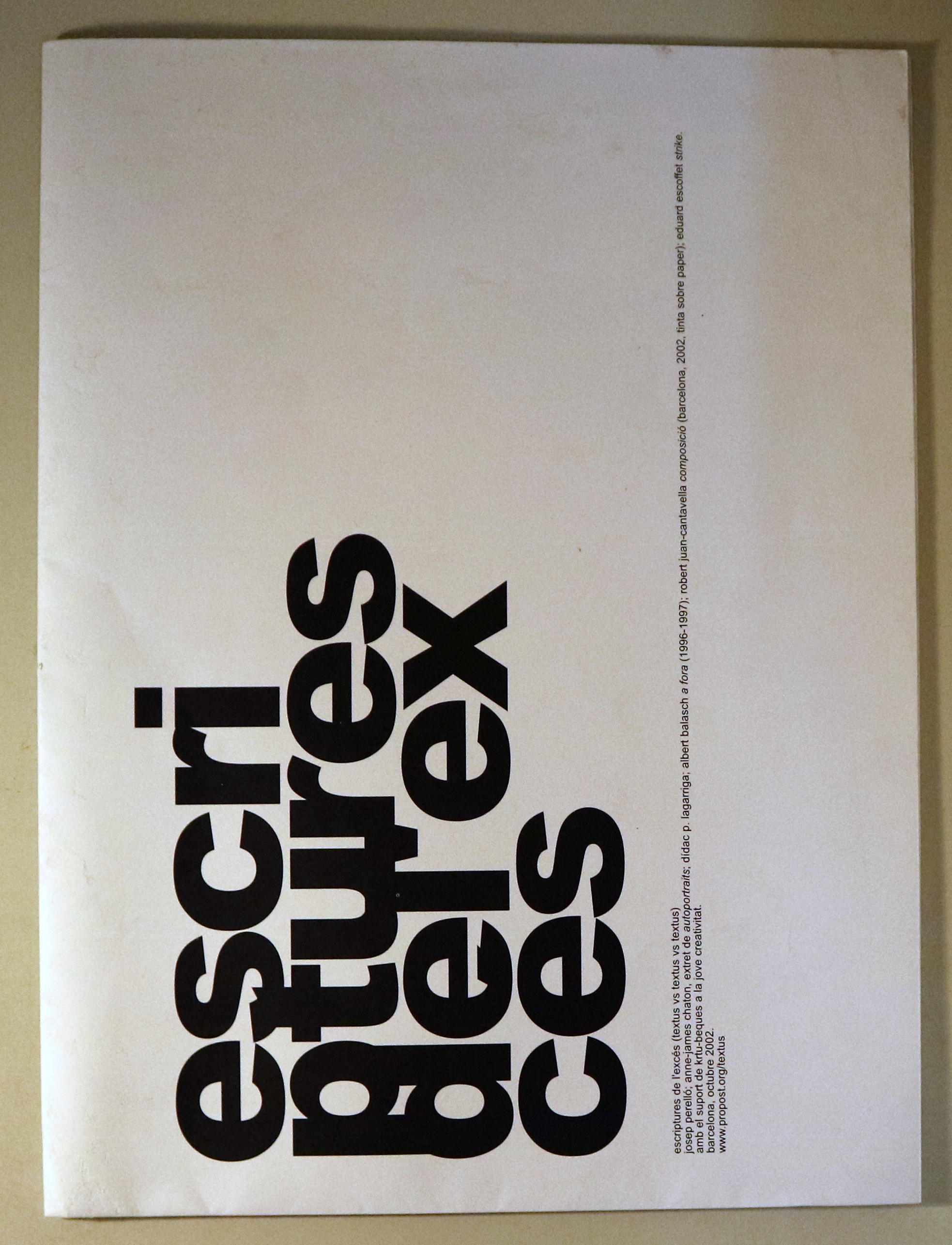 Barcelona, Edit. textus, 2002. s/p. Gran foli plegat en vuit fulls. Rústica editorial un pèl deslluïda. Bon exemplar. Textos i obres de Josep Perelló, Dídac Lagarriga, Robert Juan-Cantavella, Eduard Escoffet, etc.