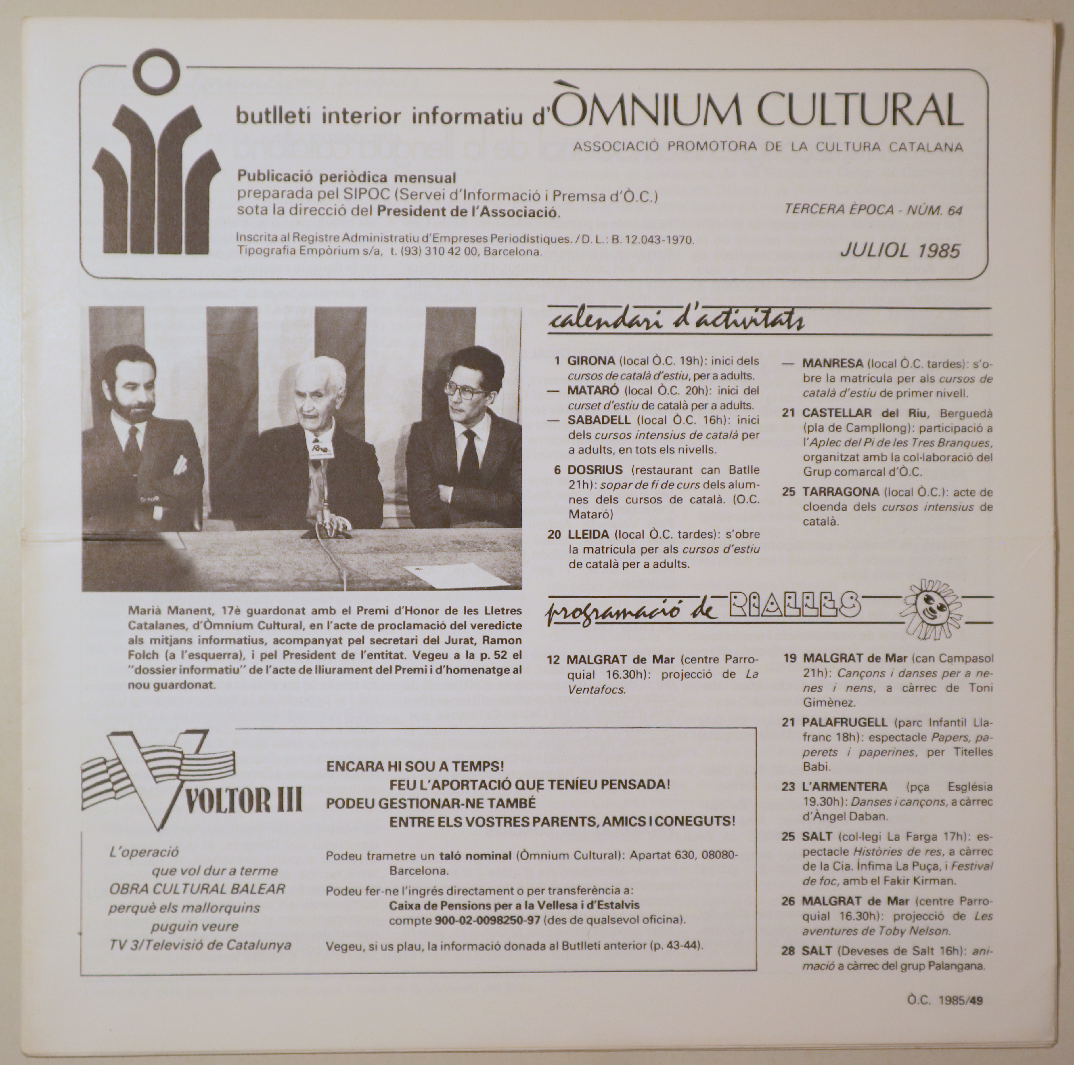 BUTLLETÍ INTERIOR INFORMATIU D'ÒMNIUM CULTURAL 3ª època, núm. 64. Juliol 1985 - Barcelona 1985 - Il·lustrat