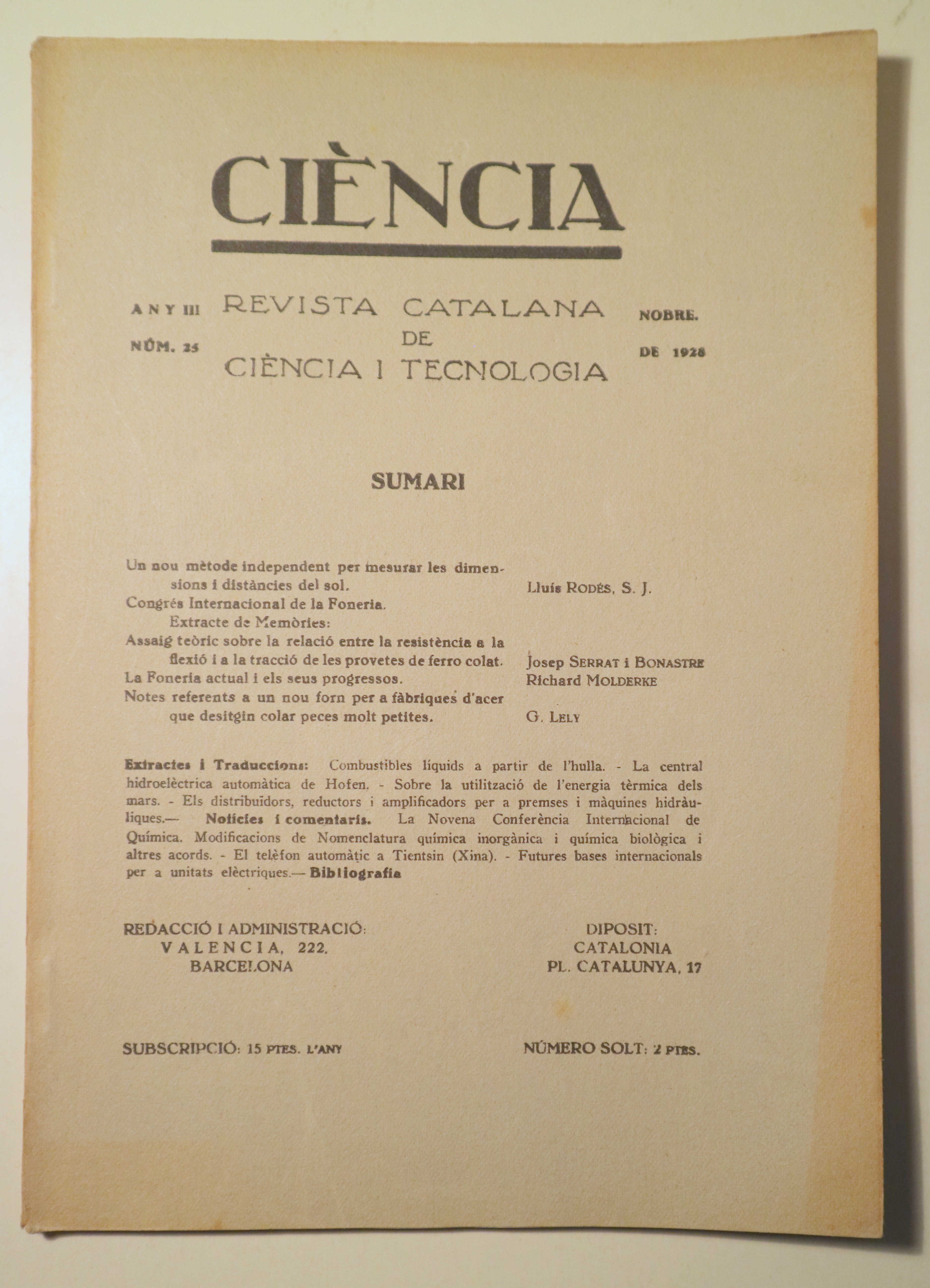 CIÈNCIA. Revista catalana de ciència i tecnologia nº 25, any III - Barcelona 1928 - Il·lustrat