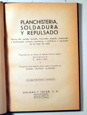 Barcelona, Dalmau y Jover / Librería Ediciones, s/d. Biblioteca de La Técnica Moderna en las Industrias Mecánicas, nº 7. Técnica del cortado, formado, encorvado, plegado, cordoneado y bordoneado, junturas mecánicas y soldadura y repulsado de las hojas de metal. Con 133 fotografías y diagramas en b/n. 107 p. 4º menor. Tela con dorados en el lomo. No conserva las cubiertas originales. Desgaste que no dificulta la lectura. Buen ejemplar.