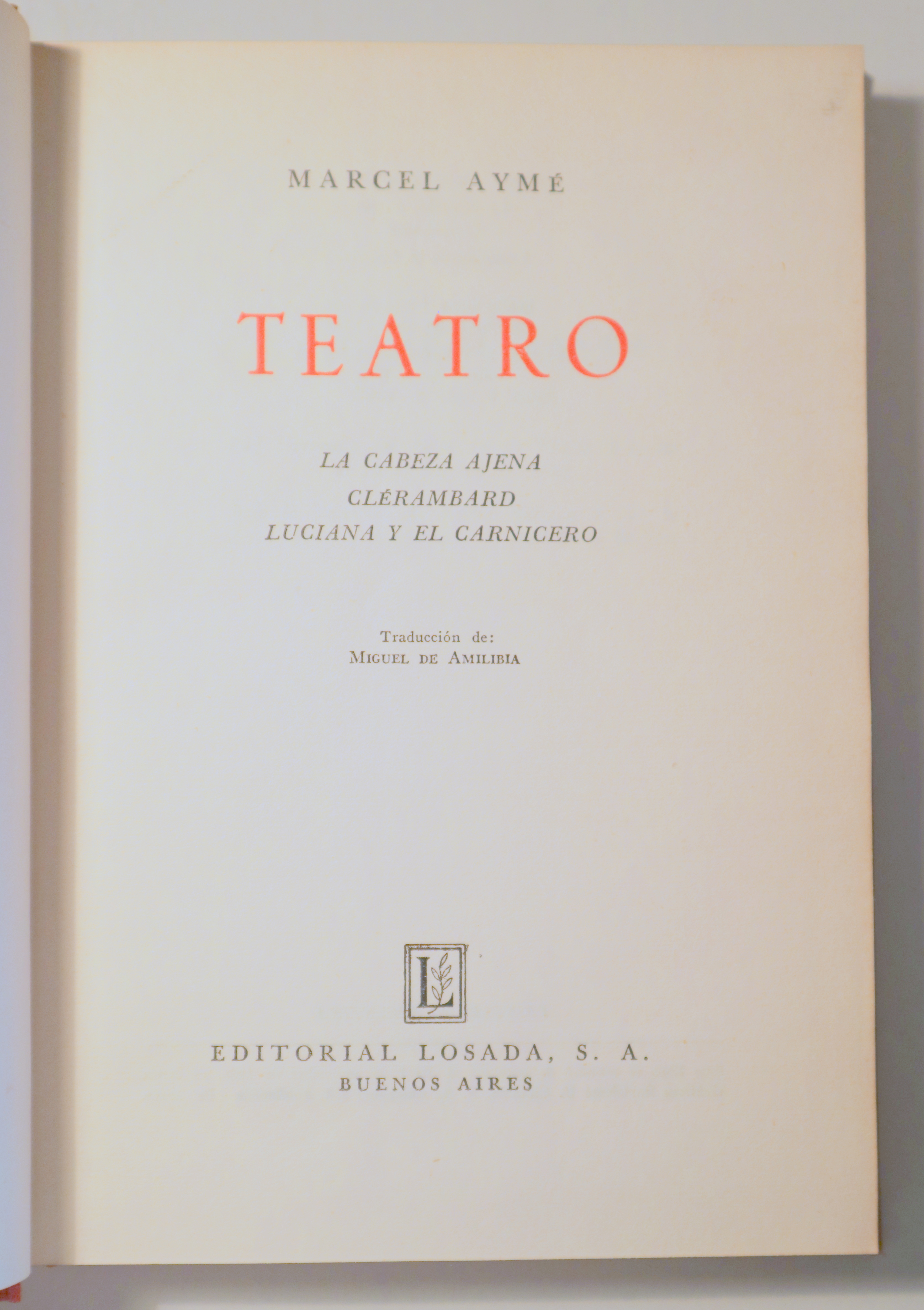 Buenos Aires, Editorial Losada, 1956. Incluye: La cabeza ajena, Clérambard, Luciana y el carnicero. 301p. 8º. Tela editorial con tejuelo y dorados en el lomo. Muy buen ejemplar.