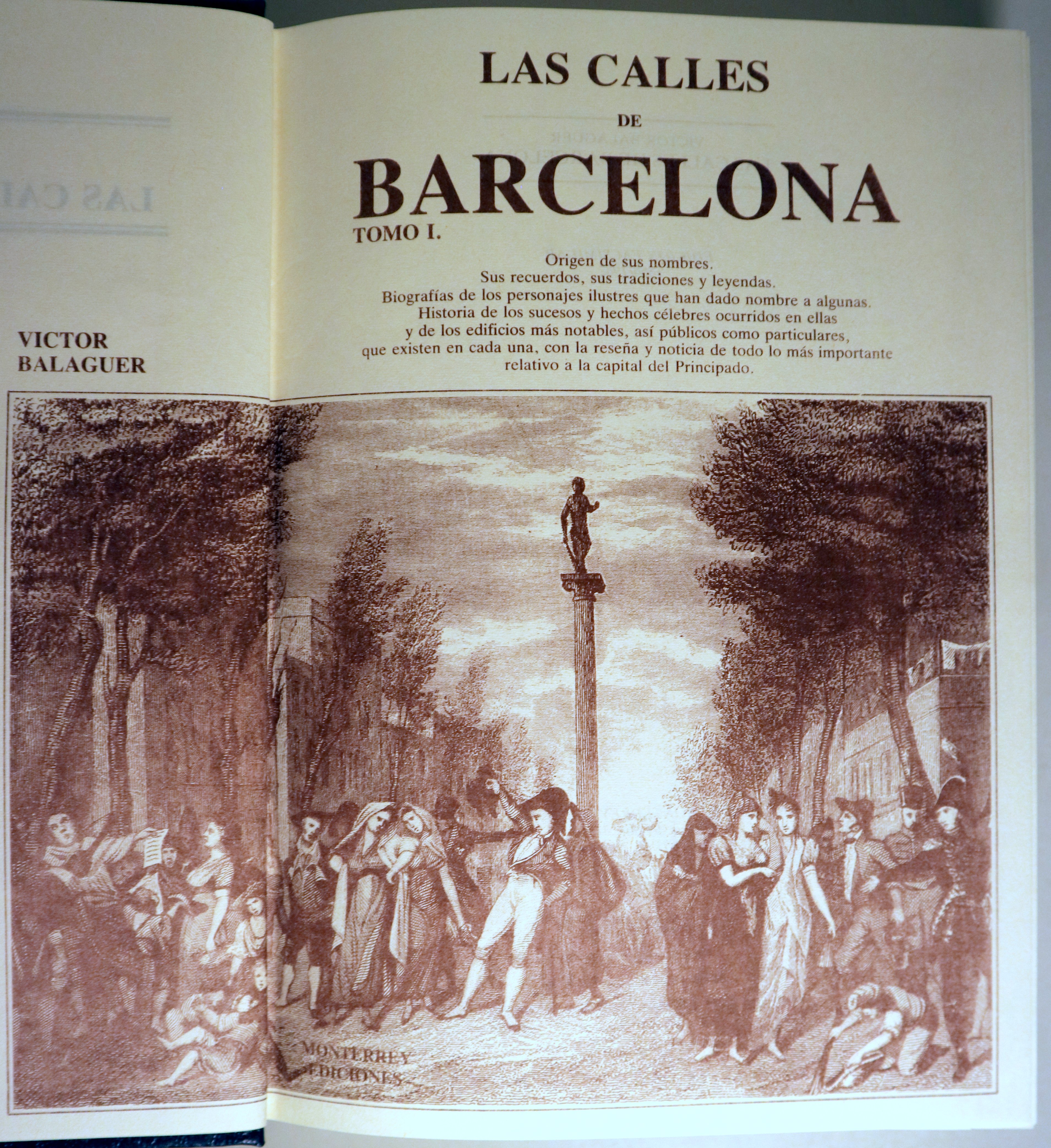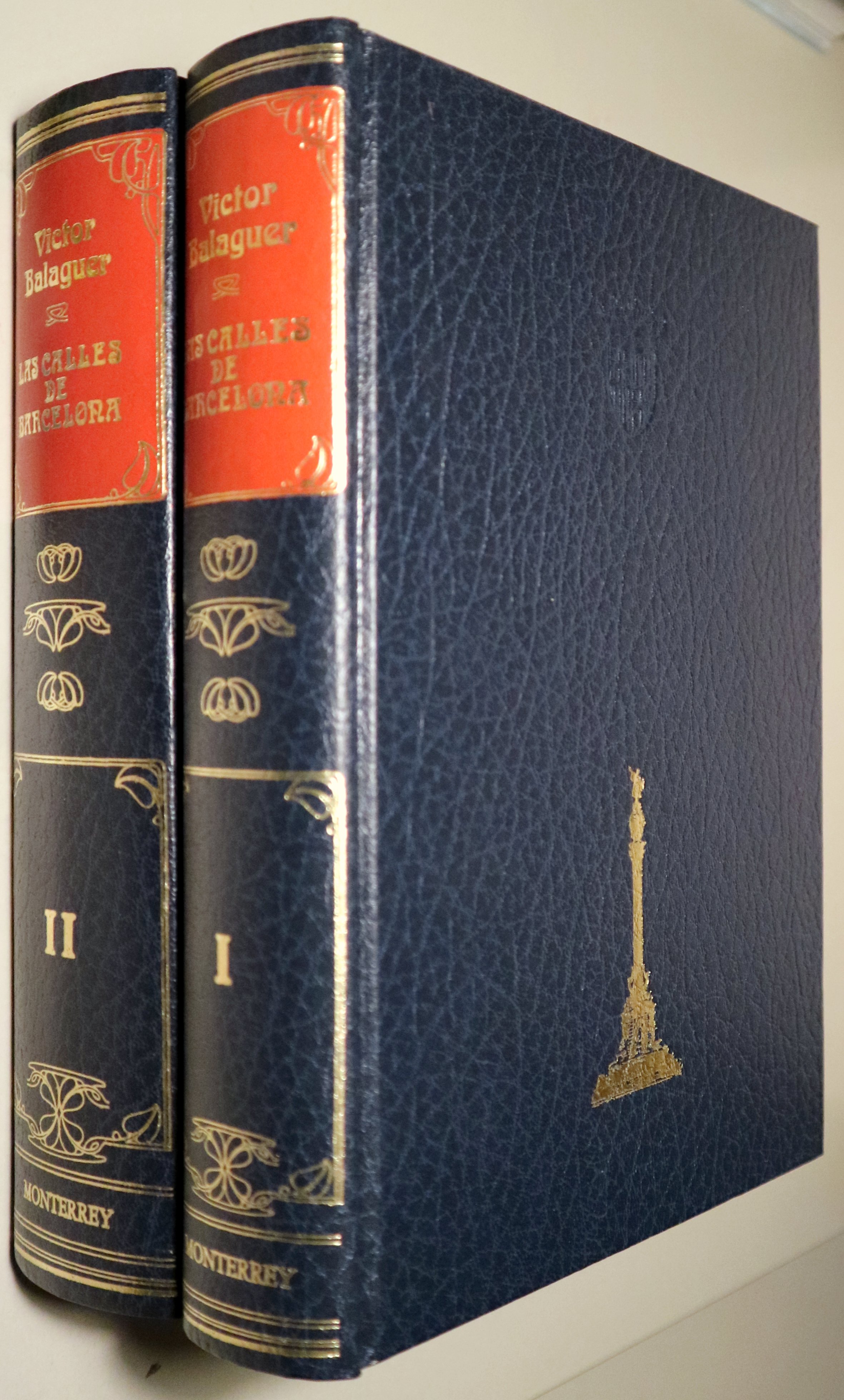 Madrid, Monterrey Ediciones, 1982. Edición facsimilar de la edición de 1865 por Salvador Manero Editor. Láminas en b/n fuera-texto. 590 p cada tomo. 4º. Guaflex editorial con dorados en la cubierta y en el lomo. Muy buen ejemplar. Edición de lujo. Contiene las calles de Barcelona,el origen de sus nobres,sus recuerdos,tradiciones y leyendas.Biografías de los personajes ilustres que han dado nombre a las calles,la historia y sucesos célebres ocurridas en ellas y de los edificios más notables, así publicos como particulares, etc. Láminas a toda página. Dos planos desplegables . Retrato autor en dorso hoja pre-portada .