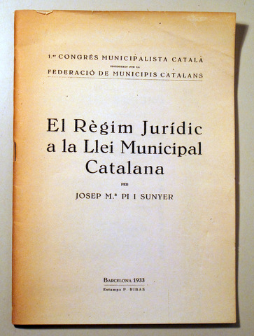Barcelona, Edit. Est. Ribas, 1933. 31p. 8è major. Rústica editorial. Resta doblec. Bon exemplar. Ponència de Josep M.ª Pi i Sunyer durant el 1er Congrés Municipalista Català organitzat per la Federació de Municipis catalans.
