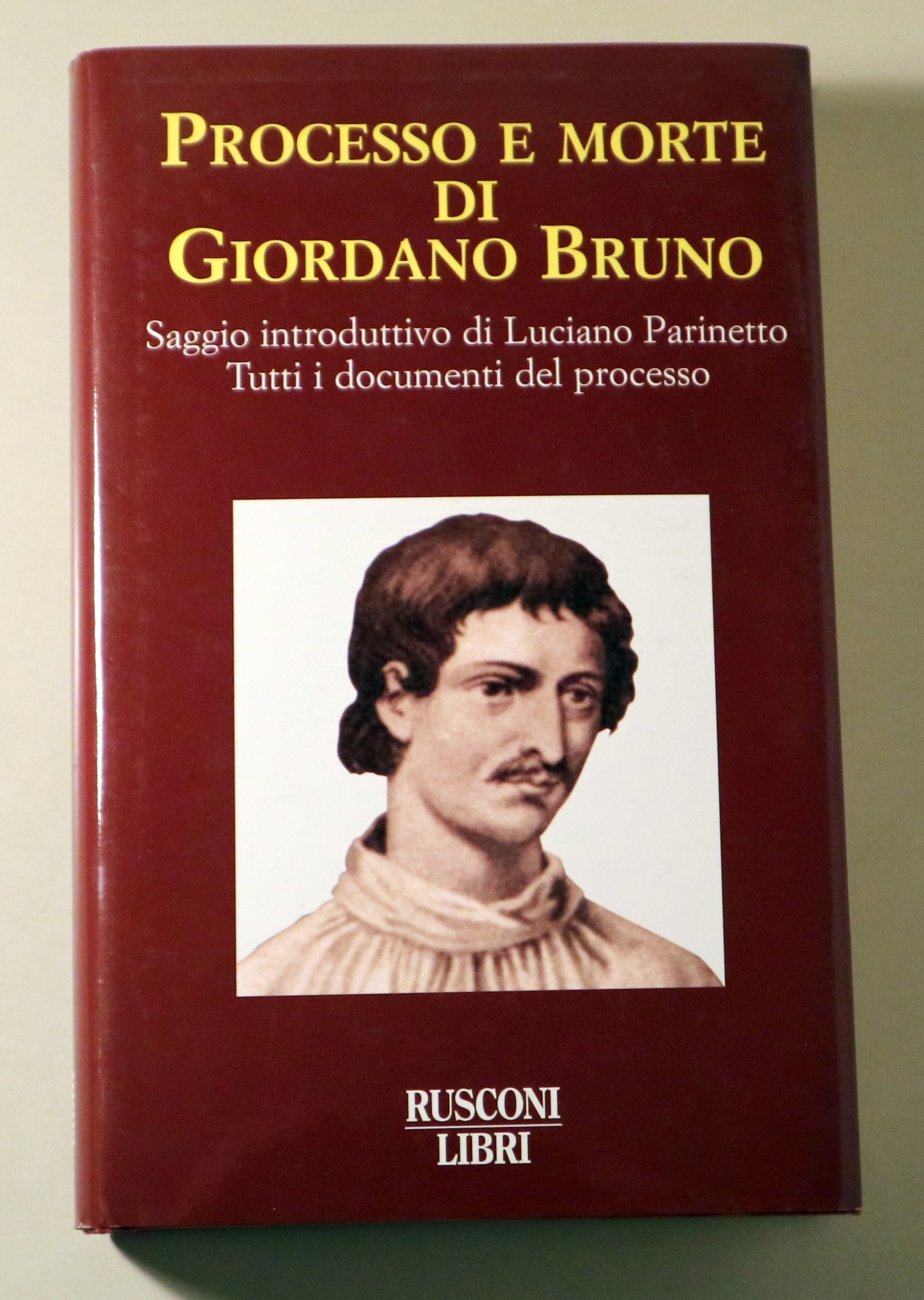 Sartancangelo di Romagna, Rusconi Libri, 1999. Saggi & Documenti. 327 p. 8º. Cartoné editorial con sobrecubierta ilustrada. Muy buen ejemplar, impecable. Libro en italiano. "Saggio introduttivo di Luciano Parinetto. Tutti i documenti del processo." 1ª edición. 1st edition. Filippo Bruno (Nola, enero o febrero de 1548-Roma, 17 de febrero de 1600), más conocido como Giordano Bruno, fue un cosmólogo, filósofo, teólogo, matemático y poeta italiano.