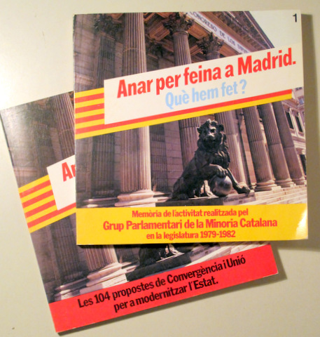Barcelona, Gràfiques Ibèria, 1982. Mem`roia de l'activitat relitzada pel Grup Parlamentari de la Minoria Catalana en la legislatura 1979-1982. Les 104 propostes de Convergència i Unió per a modernitzar l'Estat. 2 vol. 128 p. 58 p. 8è quadrat. Rústica editorial il·lustrada. Molt bons exemplar.
