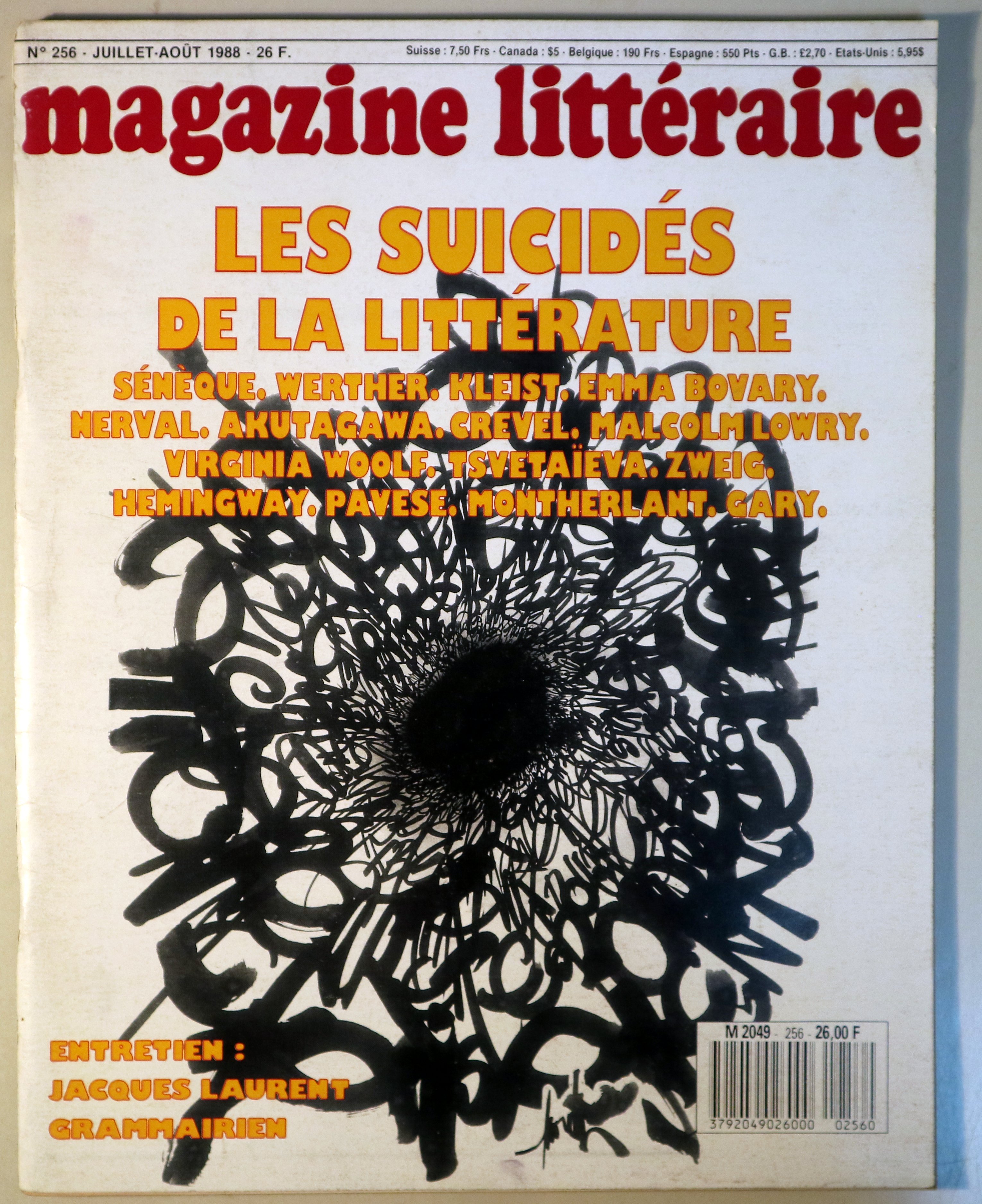 LE MAGAZINE LITTÉRAIRE, Nº 256 (Juillet-Aout 1988) Les suicidés de la littérature- París 1988 - Ilustrada