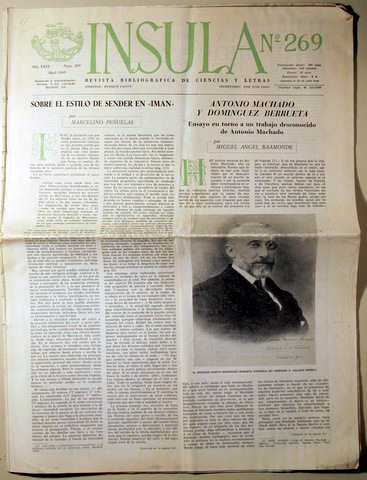 Madrid, Gráficas Benzal, 1969. 16 p. Gran folio plegado. Rústica original levemente rozada. Buen ejemplar. Textos de Miguel Ángel Baamonde sobre Antonio Machado, Marcelino Peñuelas sobre el estilo de Sender en Imán, Francisco Nieva, Domingo Miró, etc.