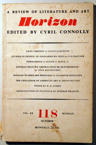 London, October 1949. Edited by Cyril Connolly. 209 a 284 p. 8º mayor. Rústica editorial fatigada. Inscripciones a lápiz de antiguo propietario en algunas páginas. Contents: LEON CHESTOV by David Gascoyne, STUDIES IN GENIUS: IX - LEONARDO DA VINCO by P. D. Partner, PERMANENCE by Roger C. Peace, Jr., ESTEBAN GRANCES 'ABSTRACTEUR DE QUINTESSENCE' by Leon Kochnitzky, HOMAGE TO BERNARD BERENSON by Raymond Mortimer, THE CHALLENGE OF AMERICAN ART by Denys Sutton, POEMS by W. H. Auden, REPRODUCTION of paintings by Esteban Frances.