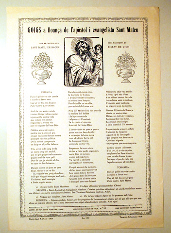 Preu reduït! GOIGS A LLOANÇA DE L'APÒSTOL I EVANGELISTA SANT MATEU - Barcelona 1978