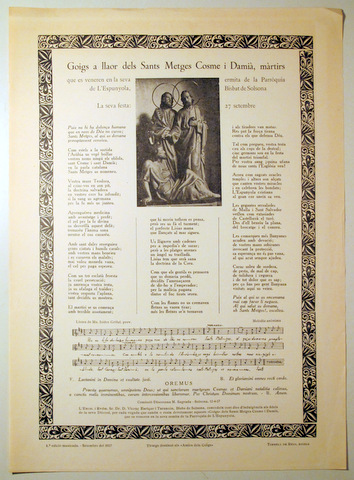 Barcelona, Edit. Amics dels Goigs - Torrell de Reus, 1957. Que es veneren en la seva ermita de la Parròquia de l'Espunyola, Bisbat de Solsona. Lletra de Mn Isidre Grifull. Melodia anònima. Rústica editorial il·lustrada. Molt bon exemplar. 1ª edició musicada.
