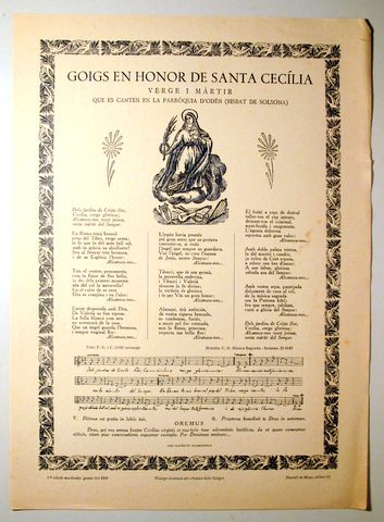 Barcelona, Edit. Torrell de Reus. Amics del Goig. 1958. Goigs en honor de Santa Cecília verge i màtis que es canten en la parròquia d'Odèn (Bisbat de Solsona). Il·lustrat. Orla. 4t. Rústica editorial il·lustrada. Molt bon exemplar.