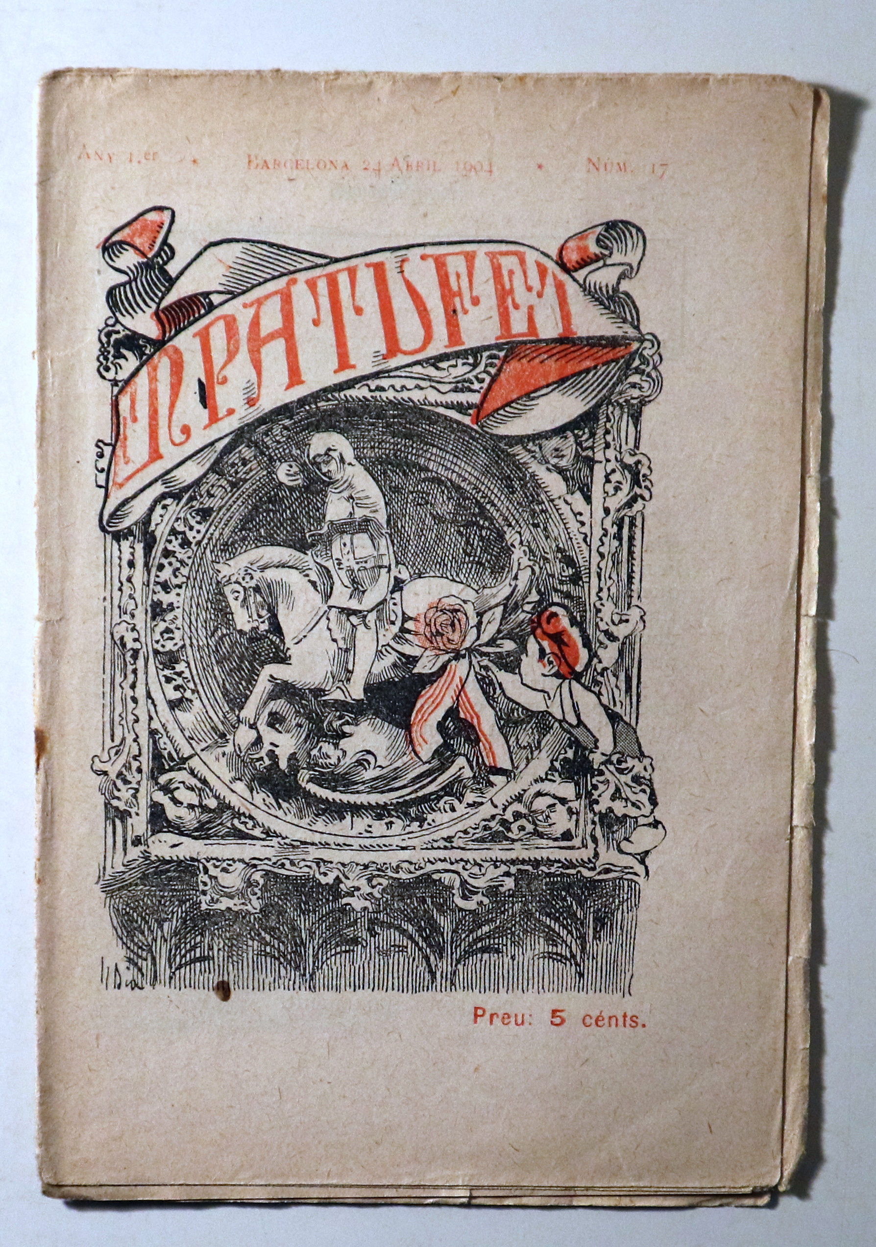 Barcelona, Patufet, 24 d'abril de 1904. Il·lustracions en b/n i a dues tintes. 17 p. 8è menor. Rústica editorial il·lustrada. Algunes taques d'òxid. Un pèl gastada. Bon exemplar.