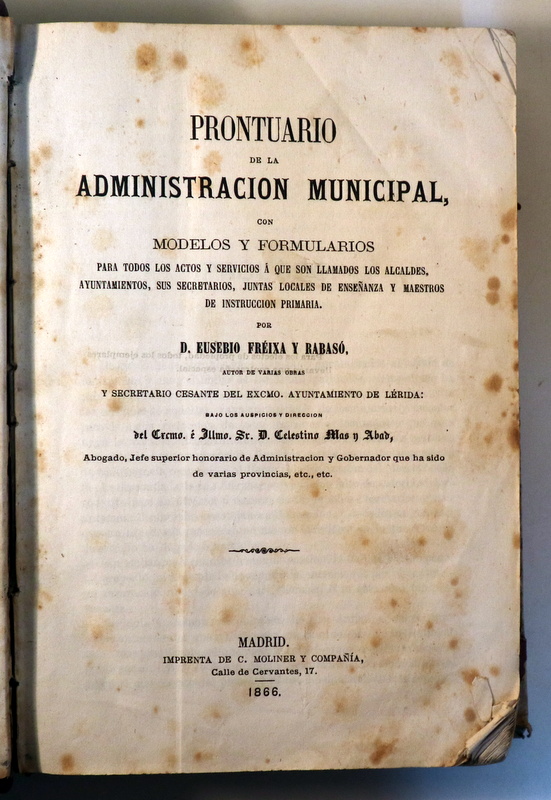Madrid, Imprenta de C. Moliner y Compañía, 1866. PRONTUARIO DE LA ADMINISTRACION MUNICIPAL, CON MODELOS Y FORMULARIOS para todos los actos y servicios a que son llamados los alcaldes, ayuntamientos, su secretarios, juntas locales de enseñanza y maestros de instrucción primariaCon gráficos. 927 p. 4º menor. Holandesa encuadernada por el antiguo propietario. Punta de la cubierta arrancada. Algunas manchas de óxido. Un poco desgastado. Completo, pero fatigado.
