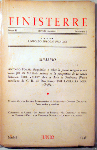 Madrid, Finisterre, 1948. 208 p. 8º. Rústica editorial tipográfica con pérdidas en el lomo y rozada. Buen ejemplar. Antonio Tovar sobre Baquílides. Poema de Paul Valéry. José Corrales Egea, Griffa (curiosa narración sobre la experiencia con el cannabis en Marruecos). Etc.