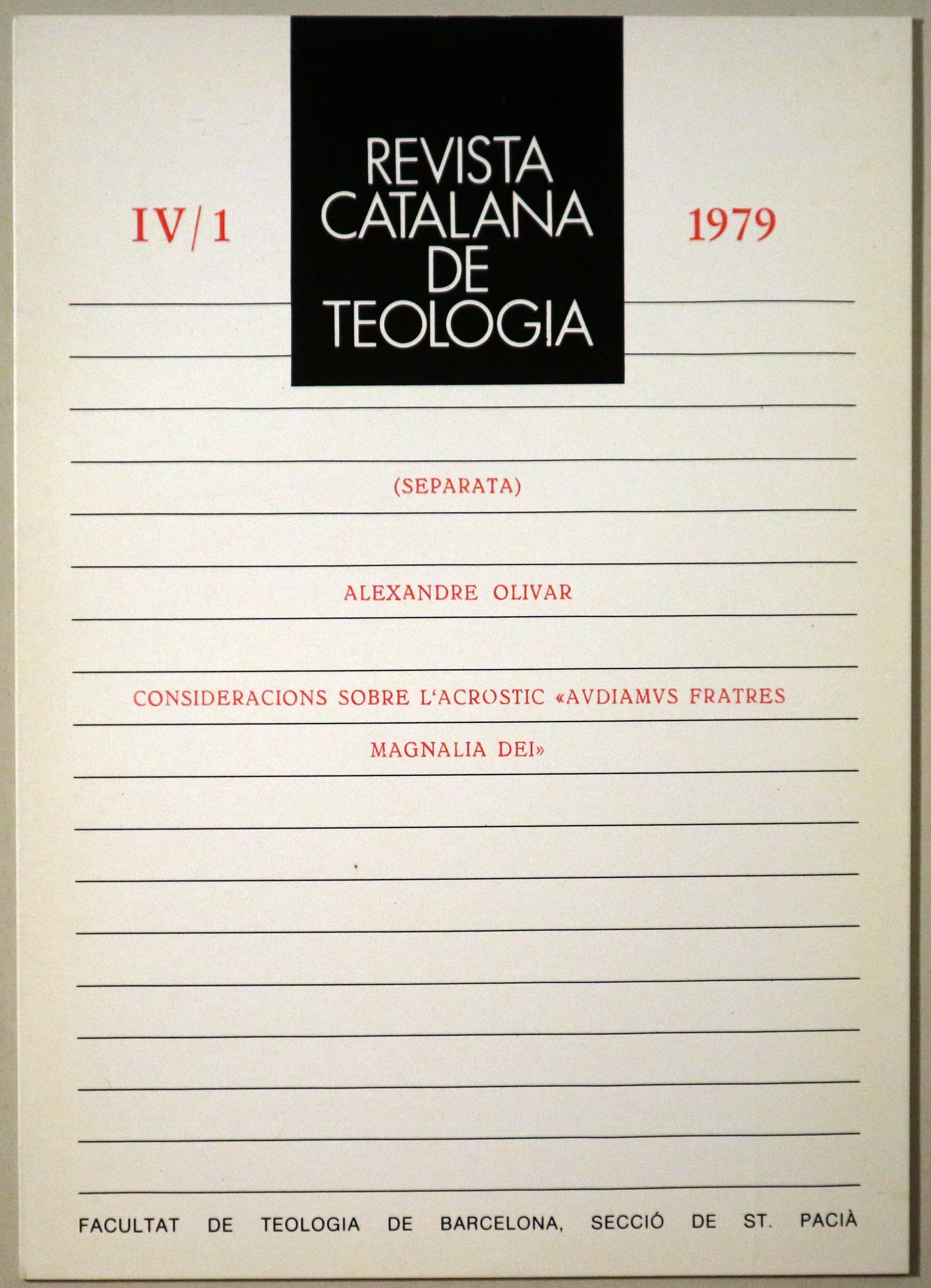 Barcelona, Facultat de Teologia de Barcelona, Secció de St. Pacià, 1979. REVISTA CATALANA DE TEOLOGIA IV/1 (Separata). De la pàgina 25 a la 32. 4t menor. Rústica editorial. Molt bon exemplar.