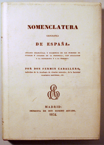 Barcelona, Edit. El Albir, 1978. Facsímil de la edición de Madrid, 1834. Nomenclatura Geográfica de España. Análisis gramatical y filosófico de los nombres de pueblos y lugares de la península, con aplicación a la topografía y la historia. Edición facsímil. 240 p. 8º. Tela editorial con sobrecubierta tipográfica. Muy buen ejemplar.