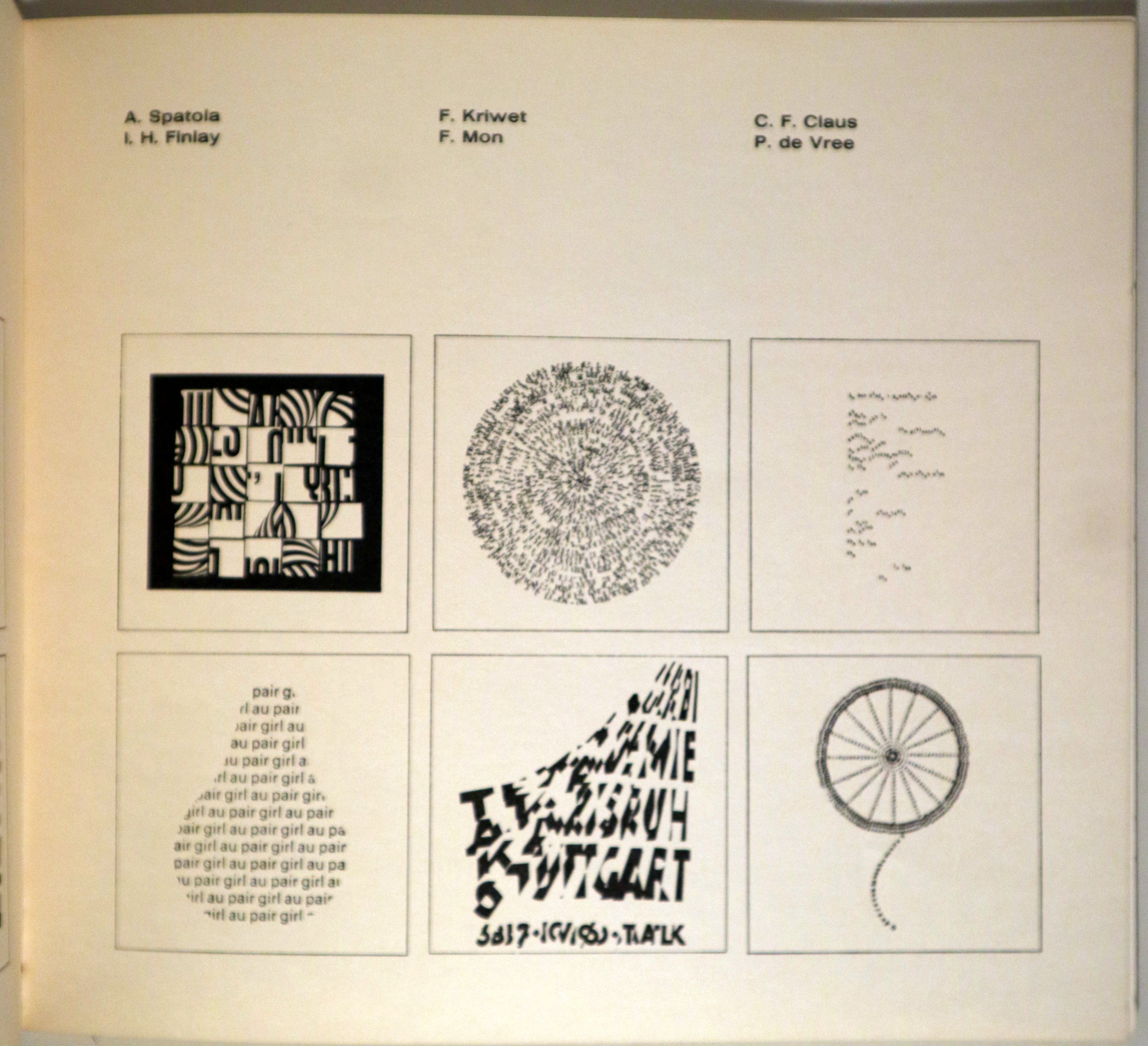 Barcelona, Instituto Alemán, 1973. Ilustraciones en b/n. s/p. 8º mayor. Rústica editorial con mínima marca de bolígrafo.. Ex-libris. Inscripción antigo propietario. Lomo levemente despegado. Buen ejemplar. Poemas, entre otros, de Grupo Noigandres, Gomringer, Garnier, Kolar, Fujitomi, Spatola, Finlay, Claus, Vree, Millán, Francico Pino, Javier Ruiz, Foix, Joan Brossa, Ràfols Casamada, Santi Pau, etc.