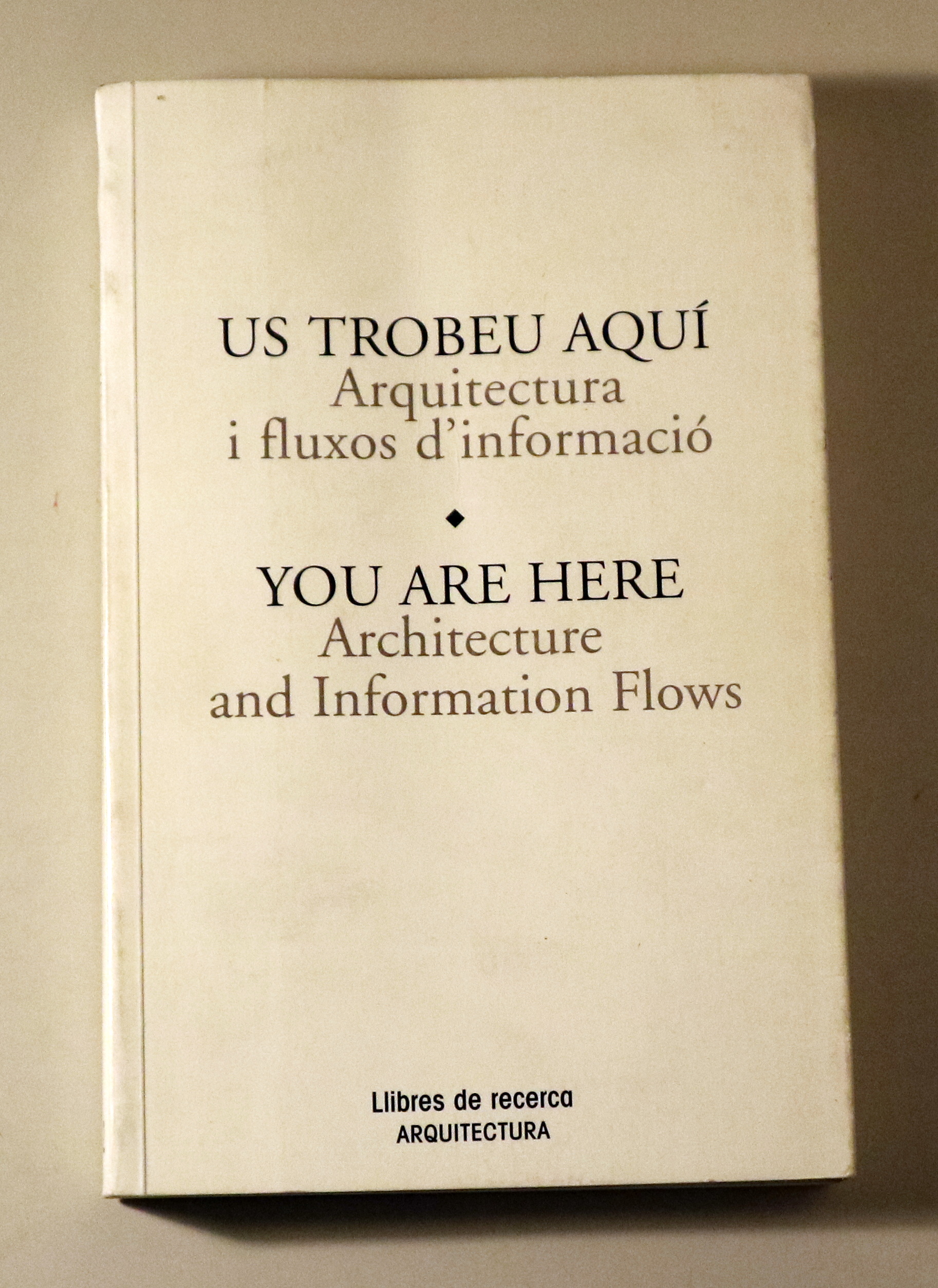 Barcelona, Llibres de Recerca, 1995.You are here. Architecture and Information Flows. Il·lustracions en b/n fora text. 194p. 8è major. Rústica editorial, un pèl gastada. Llibre emn català i anglès. Book in English. Bon exemplar. «En aquests temps, intentar orientar-nos és cada cop més desorientador.» A partir d'aquesta idea, Laura Kurgan reflexiona sobre la ubicació en l'espai i la cartografia del desplaçament. A la instal·lació que va organitzar el MACBA el 1995, Laura Kurgan. Us trobeu aquí, l'artista, ajudada per un GPS (Global Positioning System), va proposar un joc esteticoespacial per ubicar el MACBA i cartografiar el lloc que ocupa el saber en un museu. Aquesta publicació recull sis assajos entorn dels temes presentats a la instal·lació i analitza els problemes filosòfics derivats de l'arquitectura i l'espai informatitzat.