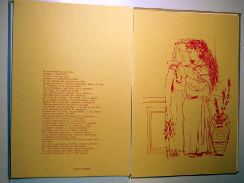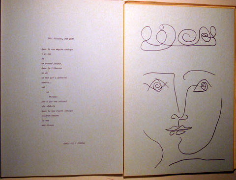 Badalona, Edit. Ajunt. Badalona, 1982. Carpeta amb motiu de sant Jordi amb poemes d'autors badalonins en homenatge a Picasso. Disseny de la carpeta de Jordi Tolosa. Disseny de l'interior de Pere Rusafa sobre dibuixos de Picasso. Nombroses il·lustracions de Picasso. En rama. s/p. 4t major. Rústica editorial il·lustrada. Llom gastat. Bon exemplar. Poemes de Màrius Sampere, Joan Argenté, Enric Flo, Coloma Lleal, Cecília Paquín, Carme Oller, etc. A més, dos poemes de Rafel Alberti.