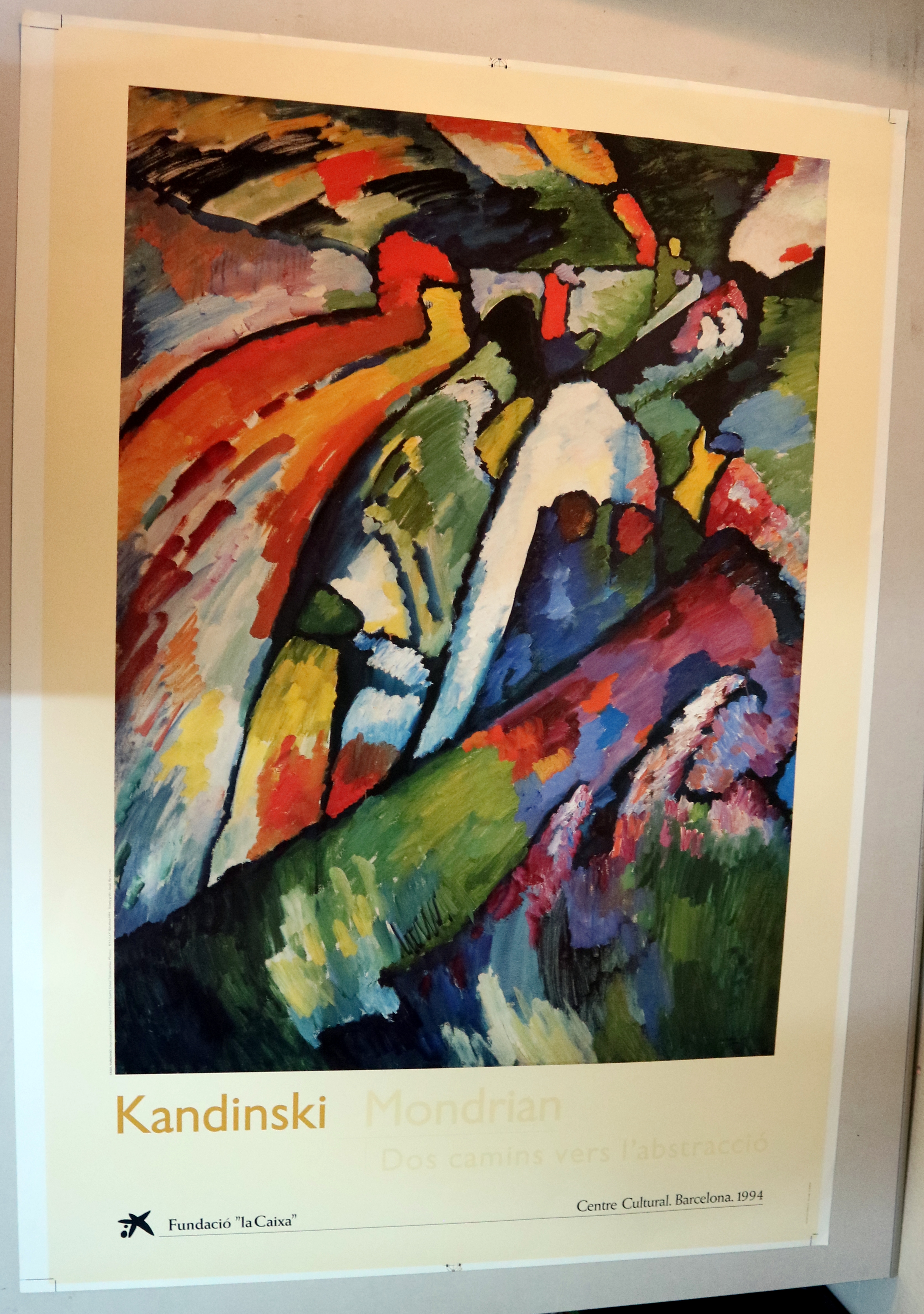 Barcelona, Fundació La Caixa, 1994. Cartell de l'exposició "Kandinsky - Mondrian, dos caminos hacia la abstracción, a la Sala de Exposiciones (Madrid 1994). 60x88 cm. Molt bon exemplar.