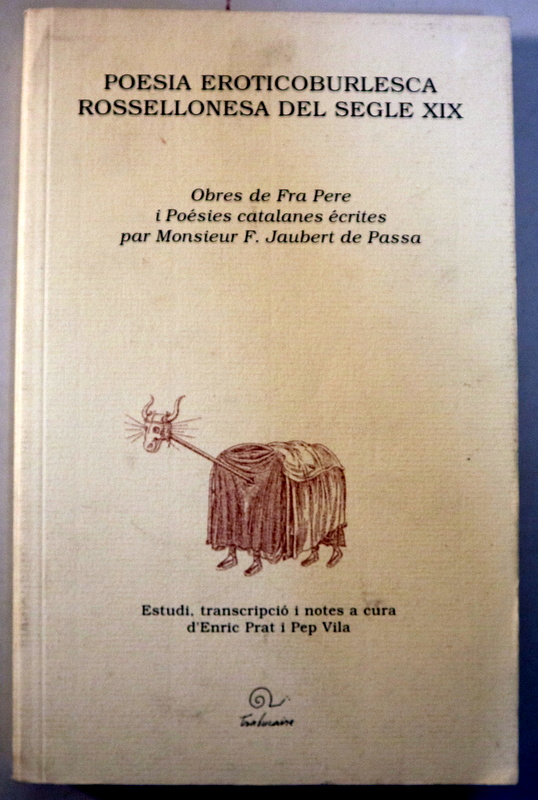 Canet, Edit. Trabucaire, 2000. Obres de Fra Pere i Poésies catalanes écrites par Monsieur F. Jaubert de Passa. Estudi, transcripció i notes d'Enric Prat i Pep Vila. 200p. 8º mayor. Rústica editorial il·lustrada. Bon exemplar.
