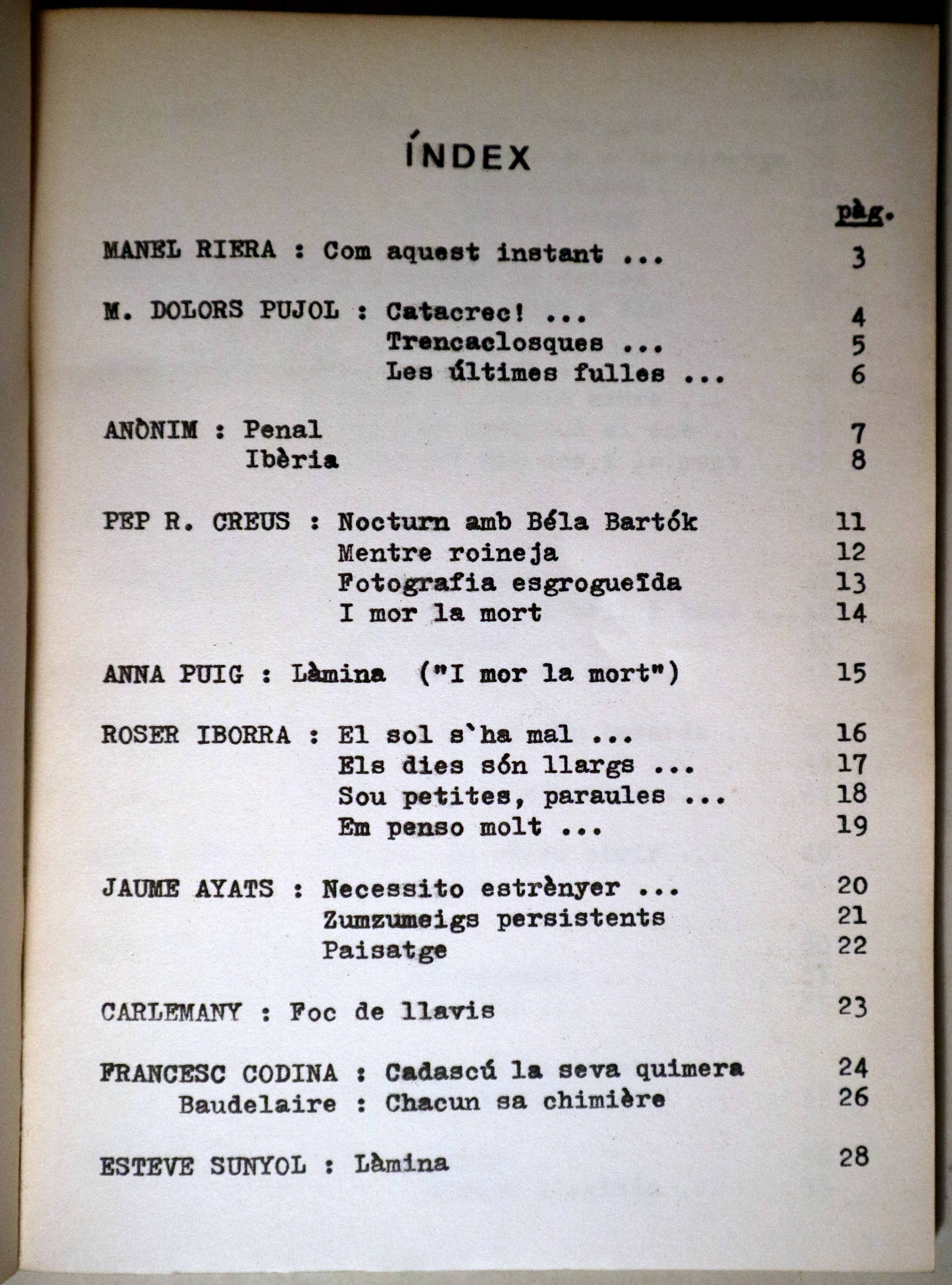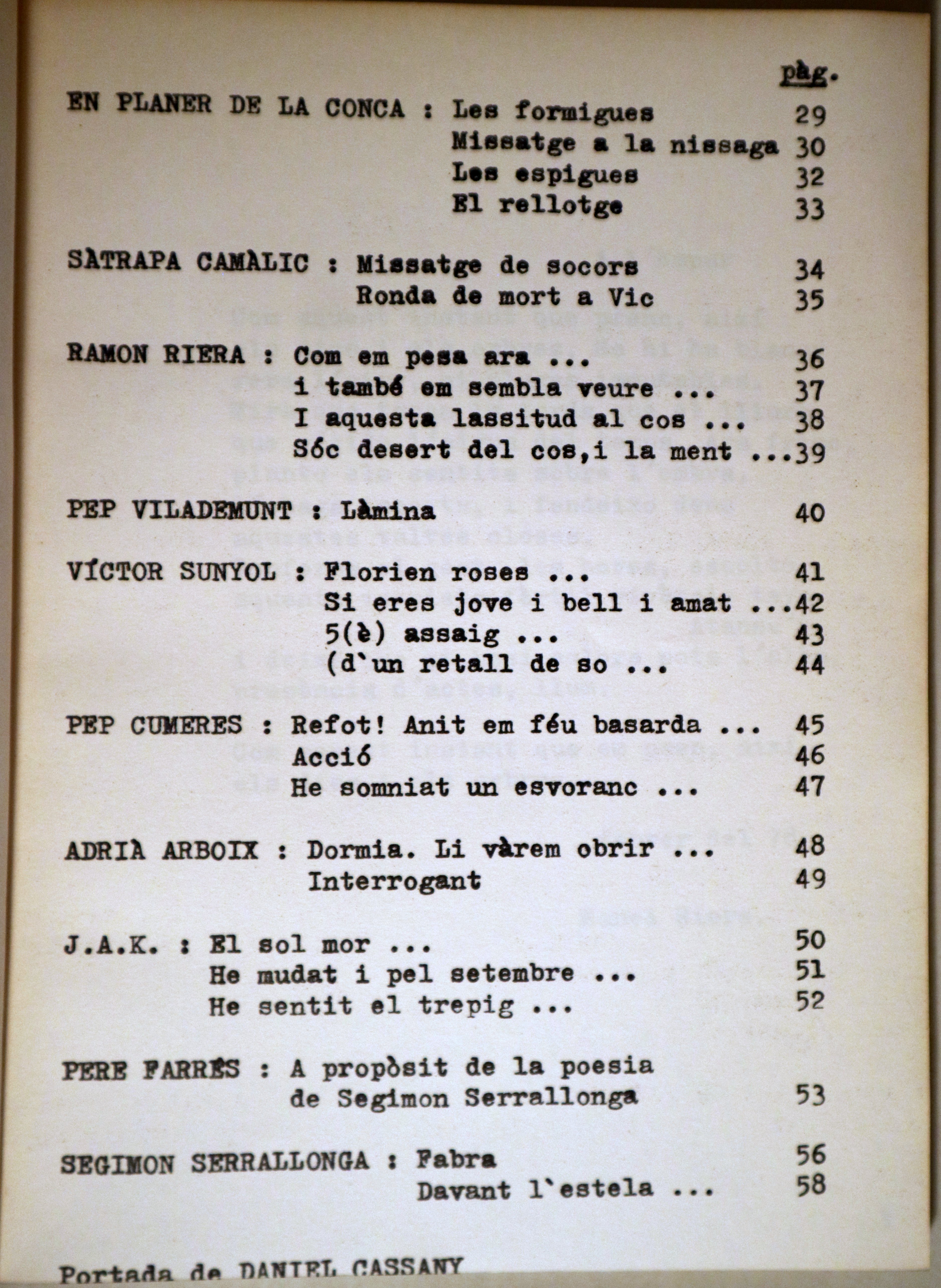 Osona, Clot, 1978. Algunes il·lustracions en b/n fora-text. 58 p. 8è major. Rústica editorial il·lustrada. Molt bon exemplar. Poemes, entre d'altres, de Ricard Creus, Víctor Sunyol, Segimon Serrallonga, etc. Coberta de Daniel Cassany. Làmina d'Esteve Sunyor.