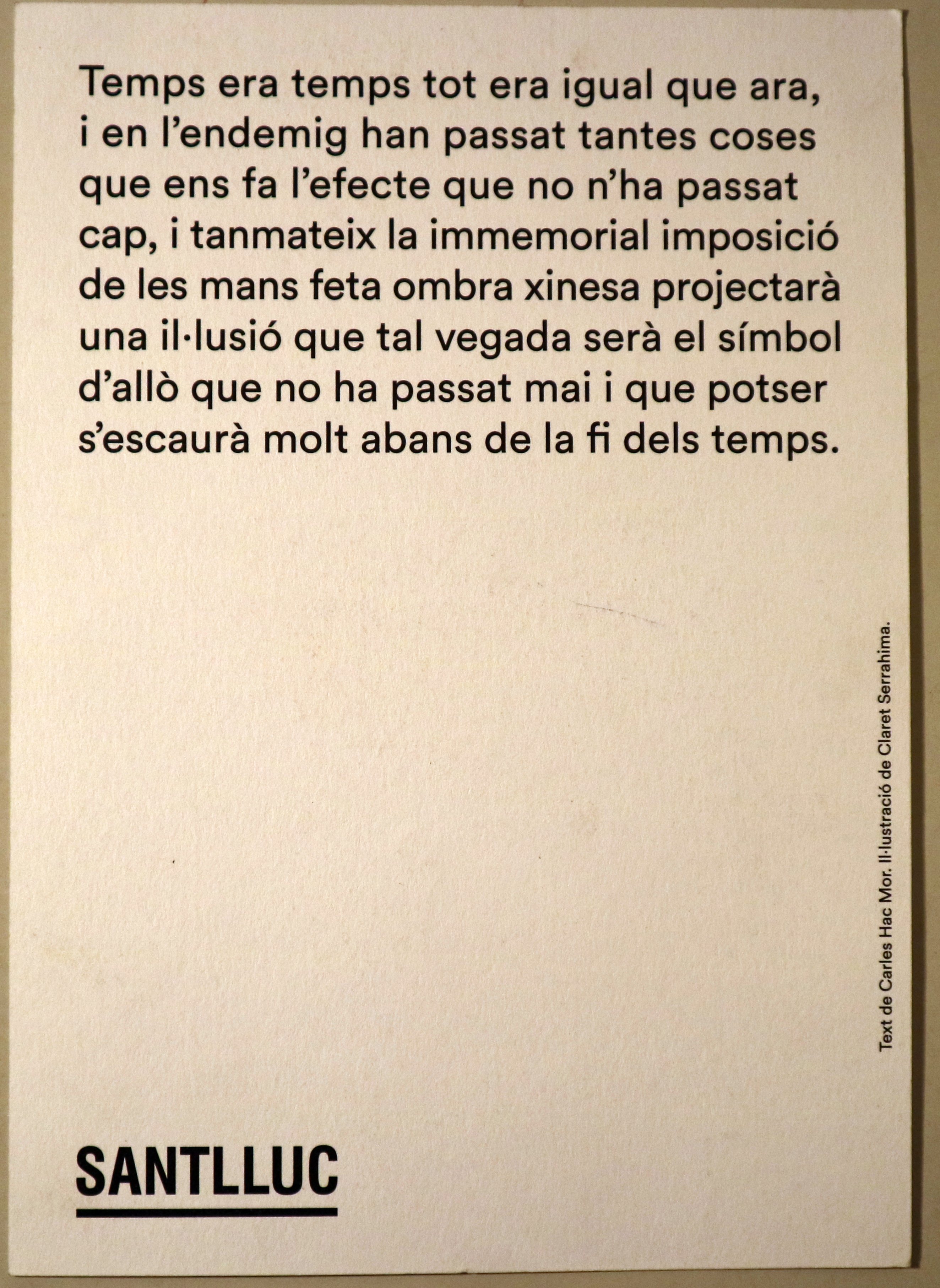 s/l, Sant Lluc, s/d. Postal en 8è major amb un poema de Carles Hac Mor i una il·lustració de Claret Serrahima. Molt bon exemplar.