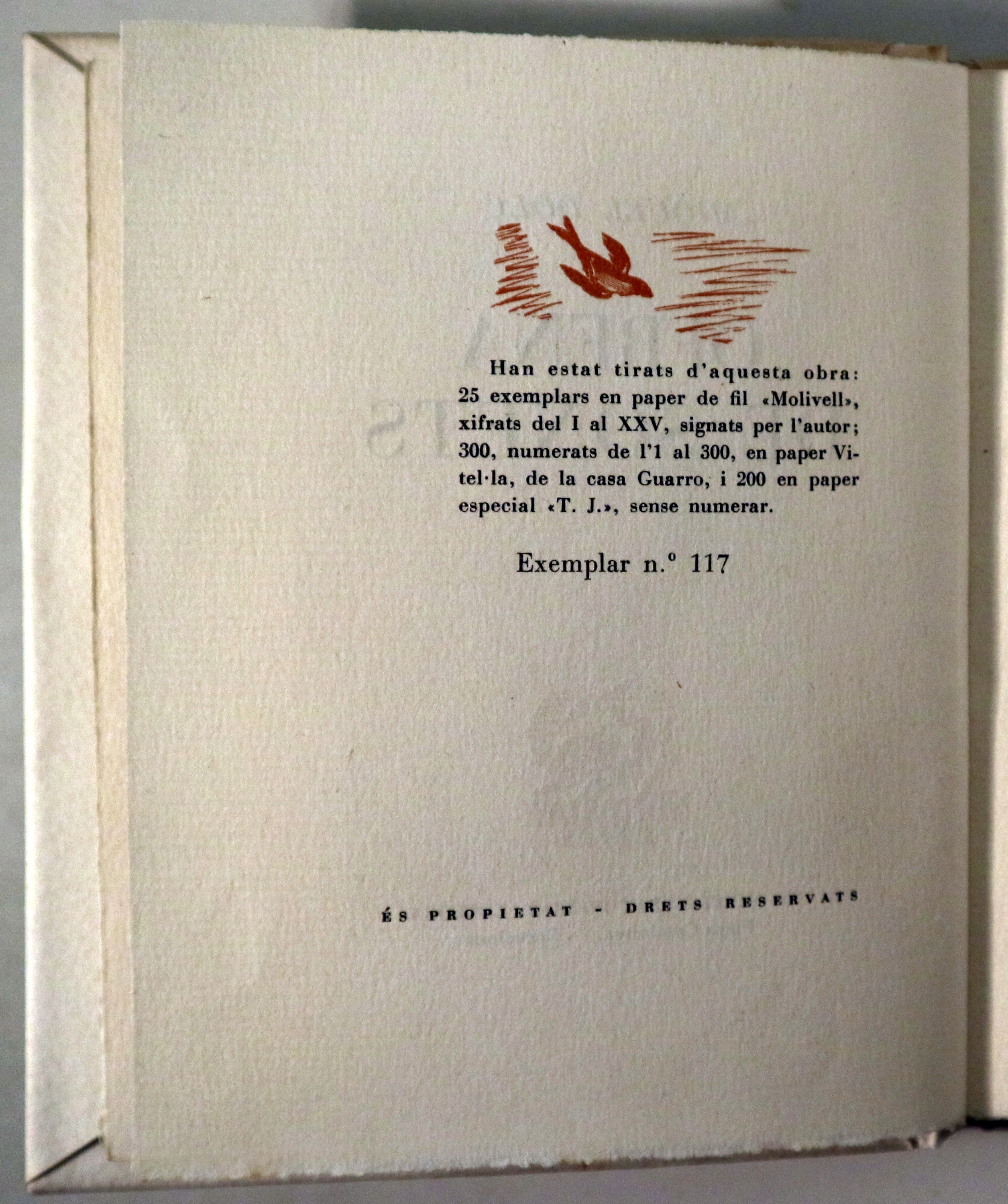 Barcelona, Editorial Estel, 1938 (1946). 300 exemplars numerats en paper Vitel.la. El nostre 117. 99p. 8è menor. Rústica editorial amb sobrecoberta il·lustrada. Per desbarbar. Molt bon exemplar. 1ª edició. 1st edition. Encara que hi consta que l'any d'edició és 1938, es va publicar el 1946 amb peu d'impremta fals per evitar la censura franquista.