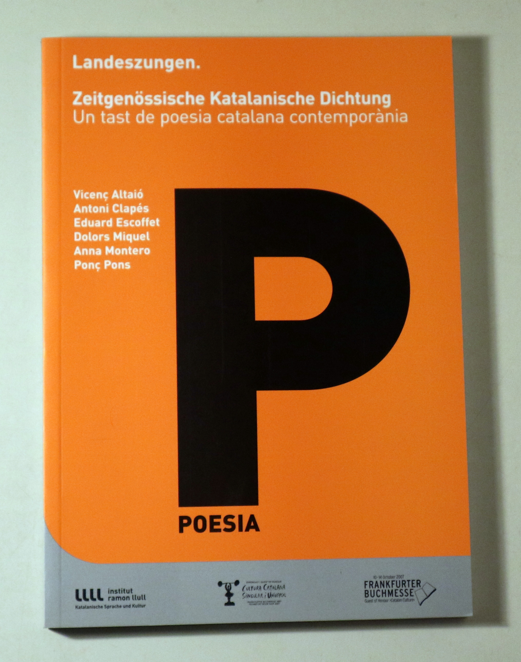 Barcelona, Institut Ramon Llull, Culturas Catalana Singular i Universal, Frankfurter Buchmesse, 2007. Edició bilingüe català-alemany. 105 p. 8è. Rústica editorial. Molt bon exemplar, impecable. 1a edició. 1st edition. Poemes de Vicenç Altaió, Antoni Clapés, Eduard Escoffet, Dolors Miquel, Anna Montero i Ponç Pons.