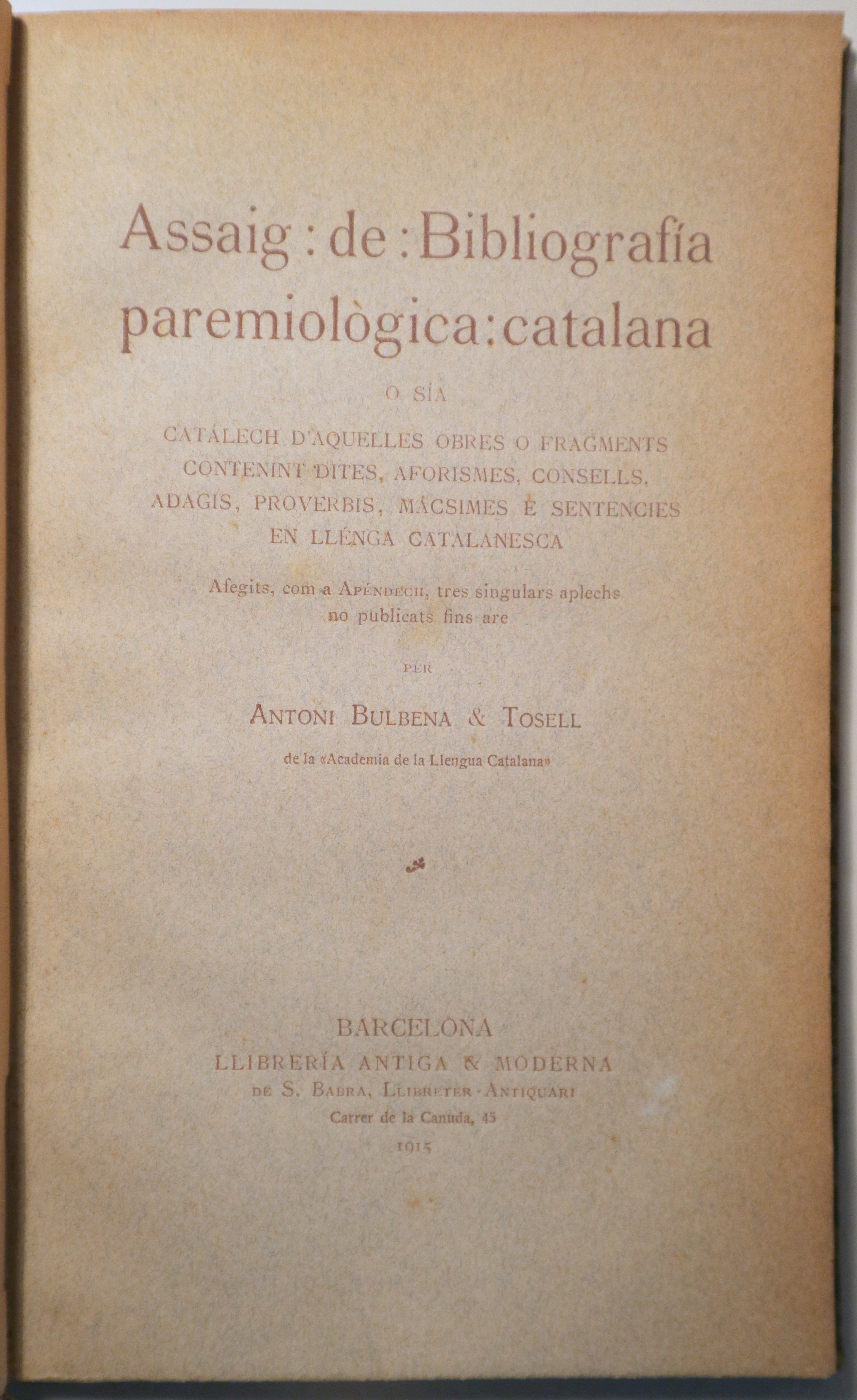 Barcelona, Edit. Llibreria Antiga & Moderna, 1915. O sía catálech dpaquelles obres o fragments contenint dites, aforismes, consells, adagis, proverbis, mácsimes e sentencies en llénga catalanesca. VIII + 103 p. 8è. Holandesa amb llom de pell i tela estampada una mica deslluïda conservant les cobertes originals. Bon exemplar. En l?apèndix conté Sentències de Séneca, extretes d?un llibre provençal del segle XIII, Frases curtes d?un filòsof francès del XIX, i una llista d?obres teatrals amb un títol paremiològic.