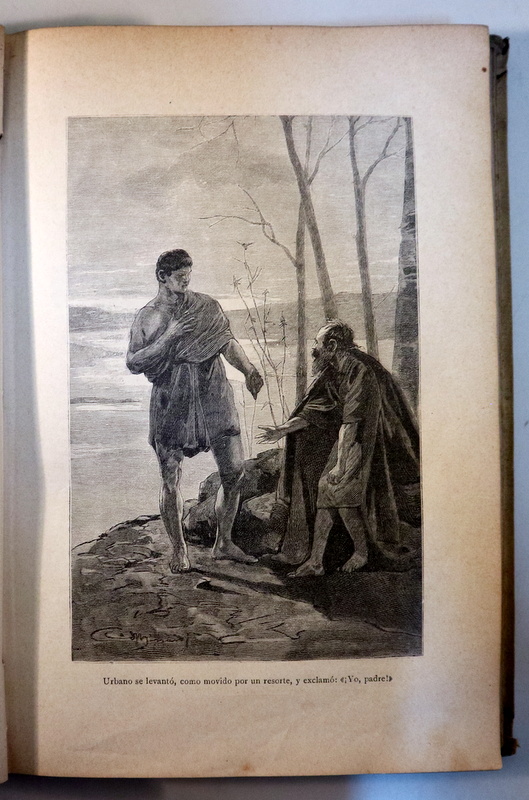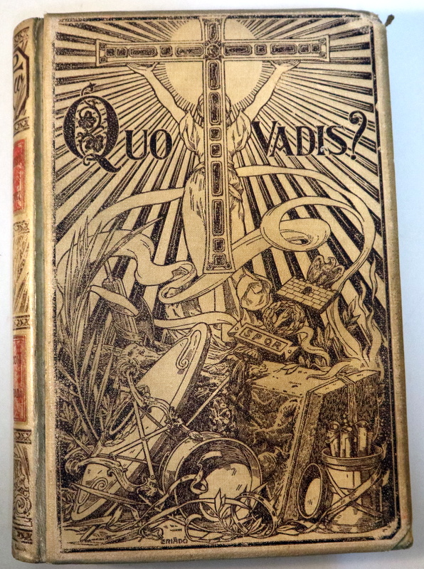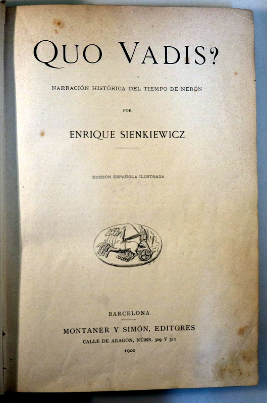 Barcelona, Montaner y Simón Editores, 1900. Narración histórica del tiempo de Nerón. Ilustrado con 48 láminas. 412 p. Encuadernación en imitación de pergamino editorial con motivos modernistas en tapa y guardas. 4º mayor. Algunas manchas de óxido. Lomo parcialmente desencolado. Un poco desgastado. Buen ejemplar. 1ª edición. 1st edition.