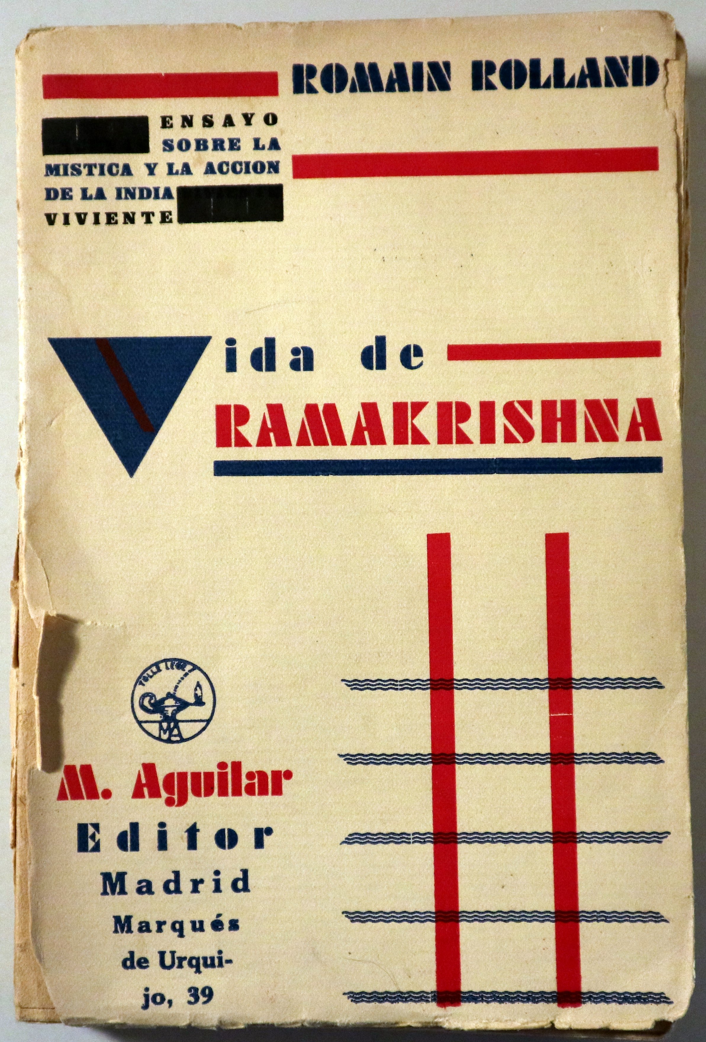 Madrid, M. Aguilar, Editor, 1931. Ensayo sobre la mística y la acción de la India viviente. 281 p. 8º. Rústica editorial tipográfica. Inscripción del antiguo propietario. CUbierta parcialmente desprendida, con faltas en los bordes. Un poco desgastado. Buen ejemplar. 1ª edición. 1st edition.
