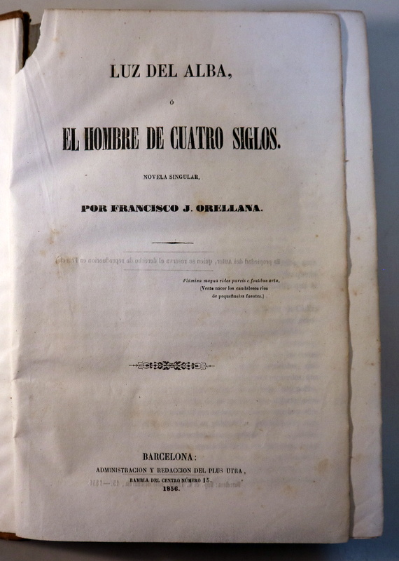 Barcelona, Administración y Redacción del Plus Utra, 1856. Grabados en b/n. 524 p. Pasta española con dorados. 4º mayor. Algunas manchas de óxido. Un poco desgastado. Leve falta en la portada. Buen ejemplar. 1ª edición. 1st edition. "Luz del alba o el hombre de cuatro siglos" es una novela del autor español Francisco José Orellana, publicada en la segunda edición de 1857 por la editorial Joaquín Bosch. Es una obra literaria con elementos de fantasía y aventura que se centra en la figura de un hombre inmortal.