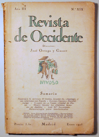 Madrid, 1925. 128 p. 8º mayor. Rústica editorial algor rozada con leves pérdidas. Lomo oscurecido. Buen ejemplar. Sumario: Francisco A. de Icaza: El Aretino, inventor del chantage, y sus relaciones con España. Oliverio Girondo: Escorial. Juerga. Claudio de la Torre: Ciudad de Plata. Moritz Geiger: La Christian Science en América. José Mª Salaverría: Meteorología para intelectuales. Notas. Ángel Sánchez Rivero: Exposiciones. Melchor Fernández Almagro: Alfonso Danvila, Las luchas fraticidas de España. Austrias y Borbones. Manuel G. Morente: Un libro sobre la psicología de los grandes calculadores. J. Vallejo: Th. Birth, La cultura romana.