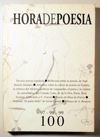 Barcelona, Edit. J. Lentini, 1990 - llustraciones en b/n. Dibujos de A. Beneyto. 187p. 4º. Rústica editorial ilustrada, algo deslucida. Buen ejemplar. ÍNDICE: DOSSIER POESÍA ESPAÑOLA. Y cien, por Rosa Lentini y Ricardo Cano Gaviria. Nota Aclaratoria. ARTÍCULOS. El Pensamiento Poético: Juan Ramón Jiménez. Para un debate sobre la crítica de la poesía, por Miguel Casado. ¿Hacia la constitución de un nuevo canon estético? La última poesía española: de la generación del 68 a la generación del 80, por Juan José Lanz. De la retórica del silencio a la poética del vacío, por Fernando R. de la Flor. Poesía viva: poéticas abiertas de posguerra, por Jaime D. Parra y Francisco Ruiz Soriano. El poeta en la ciudad, por José Ángel Cilleruelo. La poesía y la lengua poética, Cataluña, Euskadi y Galicia, por Concha García. POESÍA DE HORA DE POESÍA. Pedro Ugalde. Mario Lucarda. Alberto Tugues. Sergio Gaspar. Ramón Andrés. Rosa Lentini. Carmen Borja. José Ángel Cilleruelo. TRADUCCIONES. Rescate. Diez Sonetos de Camoens. TALLER. Siete Poetas Colombianos y un Venezolano. Justificación por Ricardo Cano Gaviria. Fernando Charry Lara. Álvaro Mutis. Giovanni Quessep. María Mercedes Carranza. Juan Manuel Roca. Juan Gustavo Cobo Borda. Santiago Mutis. Juan Calzadilla.