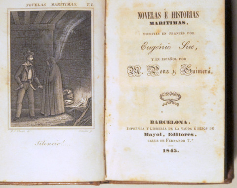 Barcelona, Edit. Mayol, 1845. Vergel Literario Tomo I. Novelas e historias marítimas escritas en francés por Eugenio Sue y en español pons Pons Guimerá. Frontis, 281 p. Con orlas y letras capitales. 8º. Pasta española editorial. Levemente rozada. Lomo con dorados. Leves puntos óxido. Cantos coloreados. Buen ejemplar. Contiene las novelas El corsario Kermok, El gorro del maestro Ultrik. 1ª edición. 1st edition.