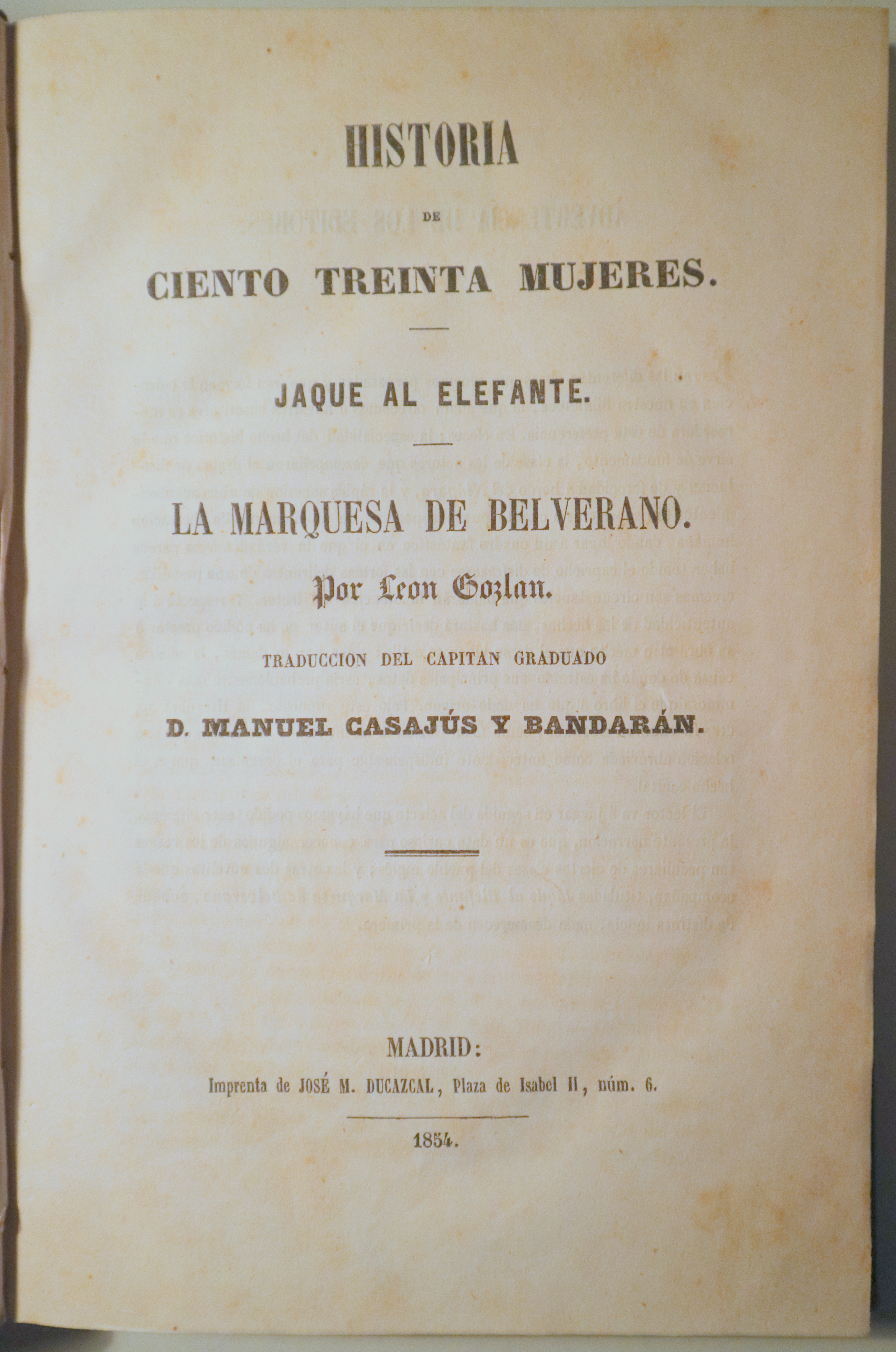 Madrid, Edit. José M. Ducazcal, 1854. Historia de Ciento Treinta Mujeres - Jaque al Elefante - La Marquesa de Belerano. Traducción del capitán graduado D. Manuel Casajús y Bandarán. Algunas ilustraciones en b/n. 262 p. 8º. Tela algo deslucida. Dorados en el lomo. Buen ejemplar.