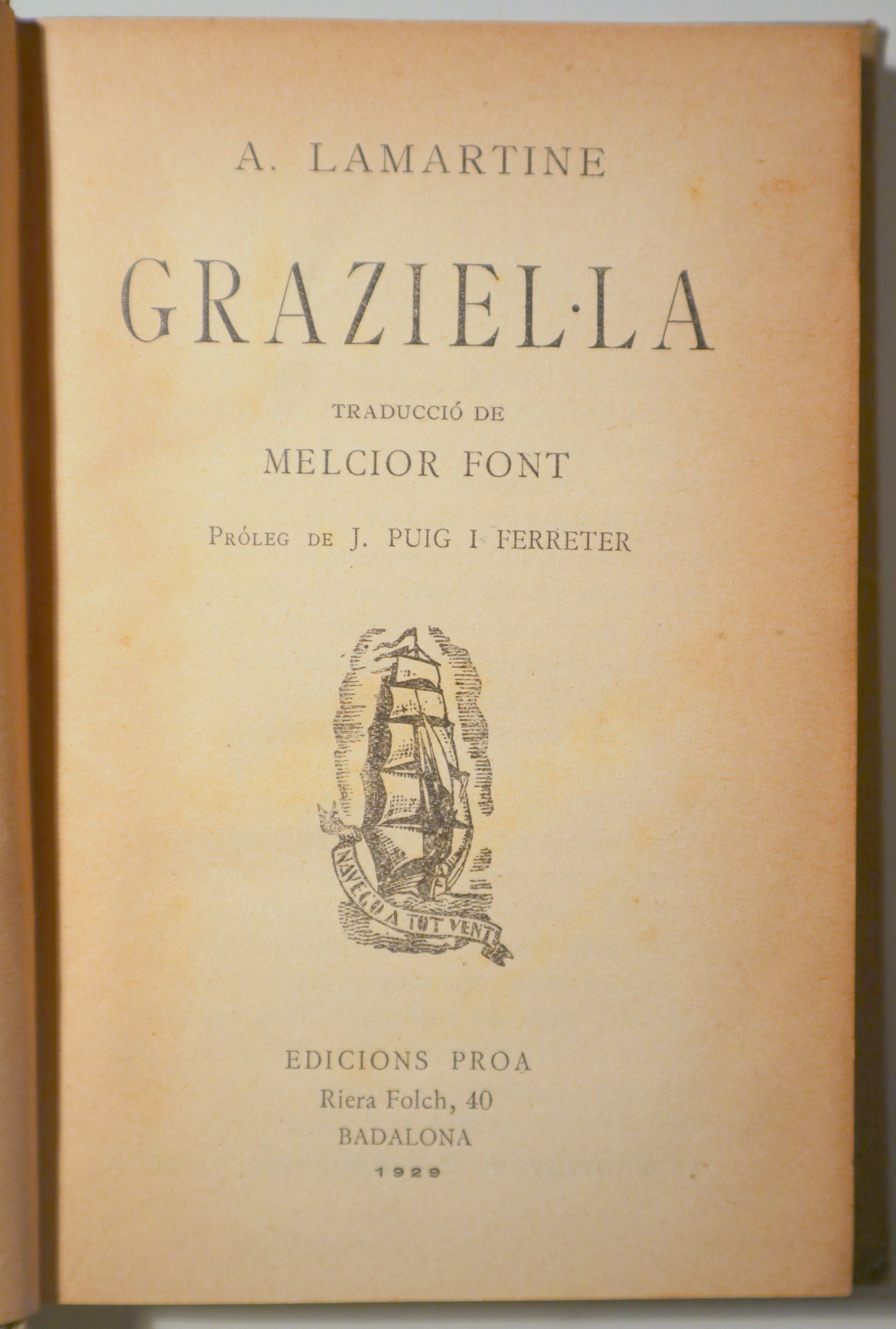 Badalona, Edicions Proa, 1929. Biblioteca A tot vent nº 8. Traducció de Melcior Font i pròleg de J. Puig i Ferreter. 231p. 8è. Cartoné editorial. Ex libris. Lleus punts d'òxid en pàgines de l'interior. Bon exemplar.