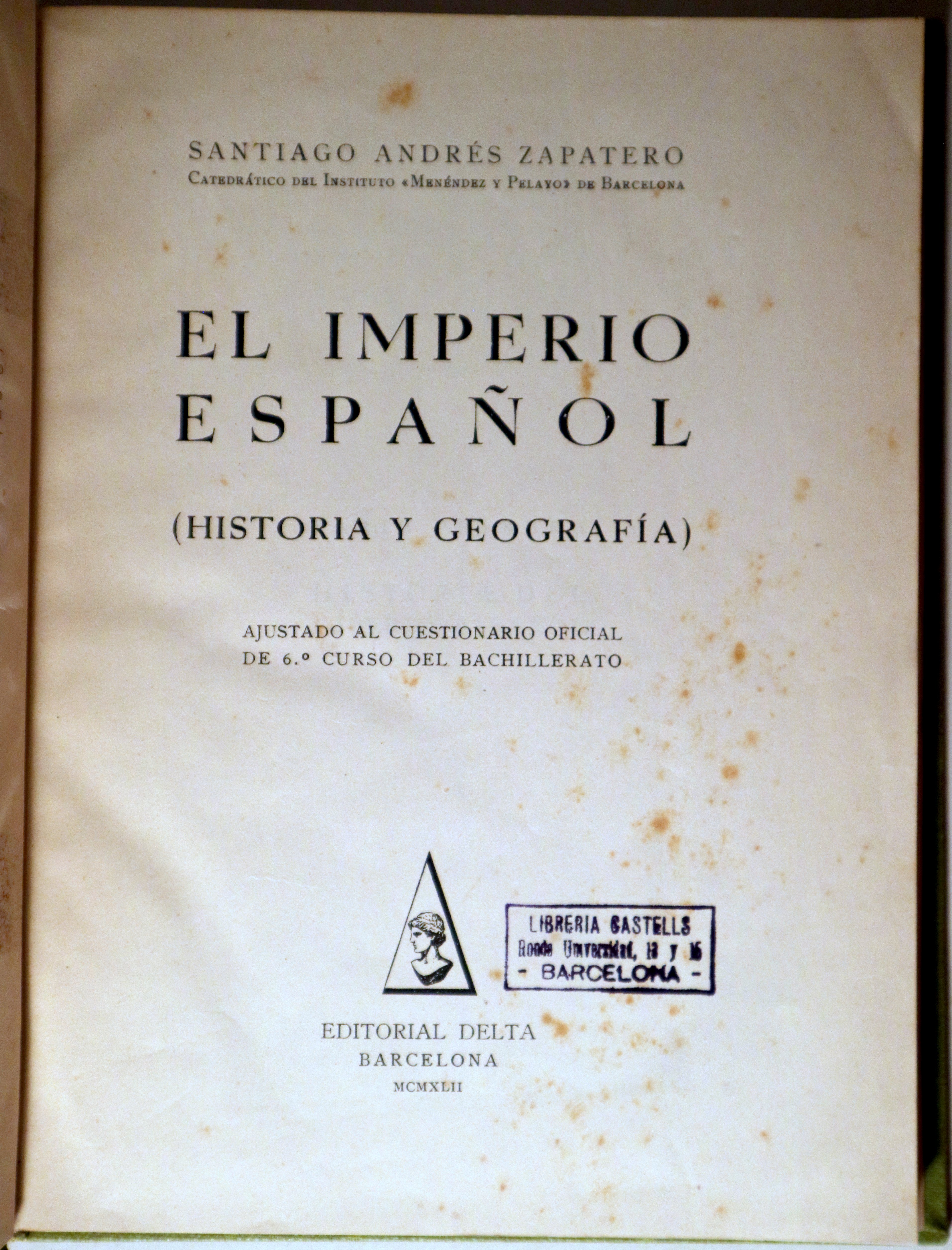 Barcelona, Editorial Delta, 1942. Ajustado al cuestionario oficial de 6º curso del bachillerato. Fotografías en b/n. 253 p. 8º mayor. Tela encuadernado por el antiguo propietario. Sello de caucho. Anotcaciones a lápiz. Algunas manchas de óxido. Un poco desgastado. Buen ejemplar.
