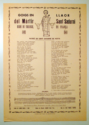 GOIGS A LLAOR DEL MÀRTIR SANT SADURNÍ. Bisbe de Toulouse, de França - Sant Sadurní de Noya 1956