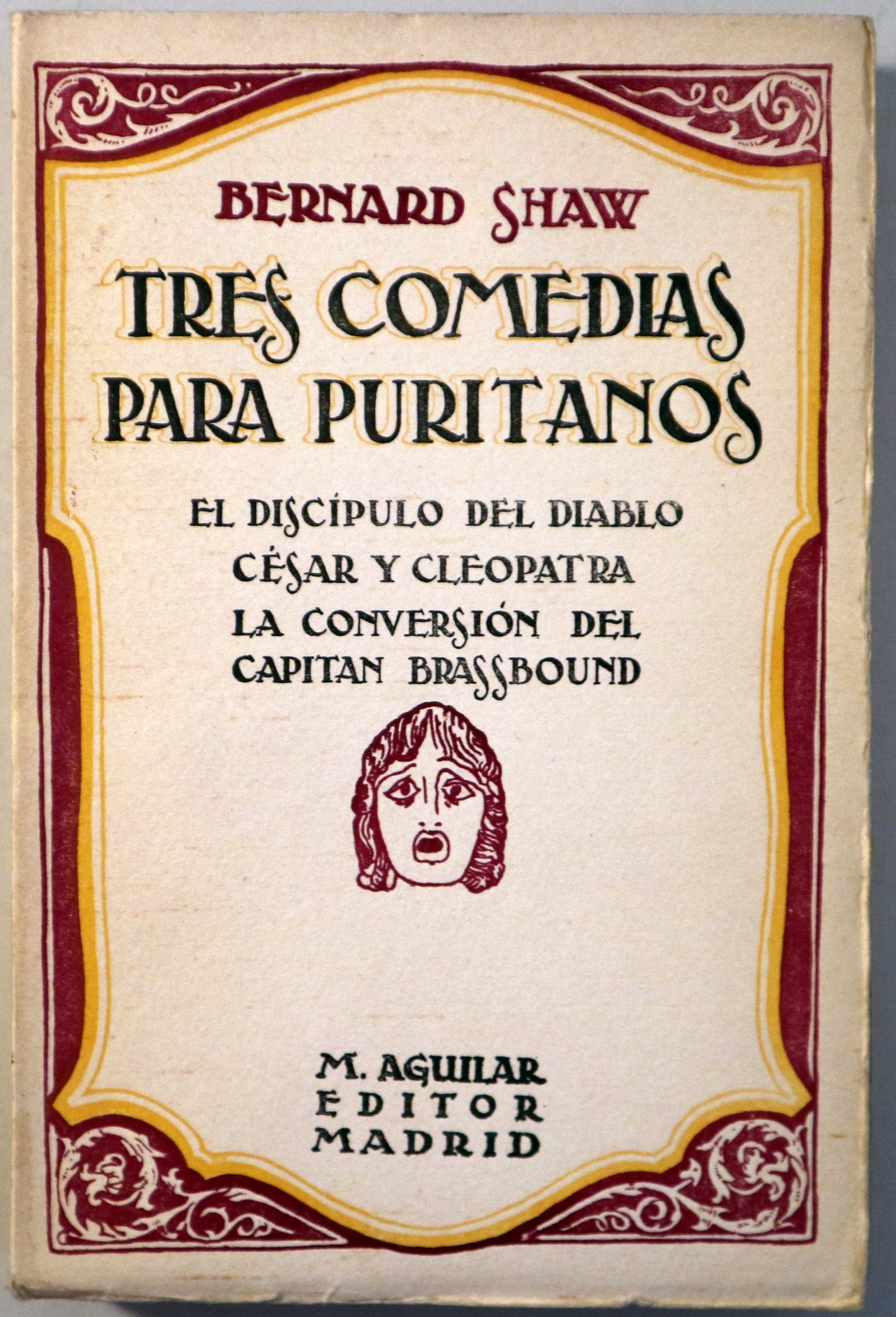 Madrid, Aguilar, 1930. Tres comedias para puritanos: El discípulo del Diablo. César y Cleopatra. La conversión del capitán Brassbound. Traducción Julio Brouta. 357p. 8º. Rústica editorial ilustrada. Firma antiguo propietario. Intonso. Levemente rozada. Interior en buen estado. Buen ejemplar. 1ª edición. 1st edition.