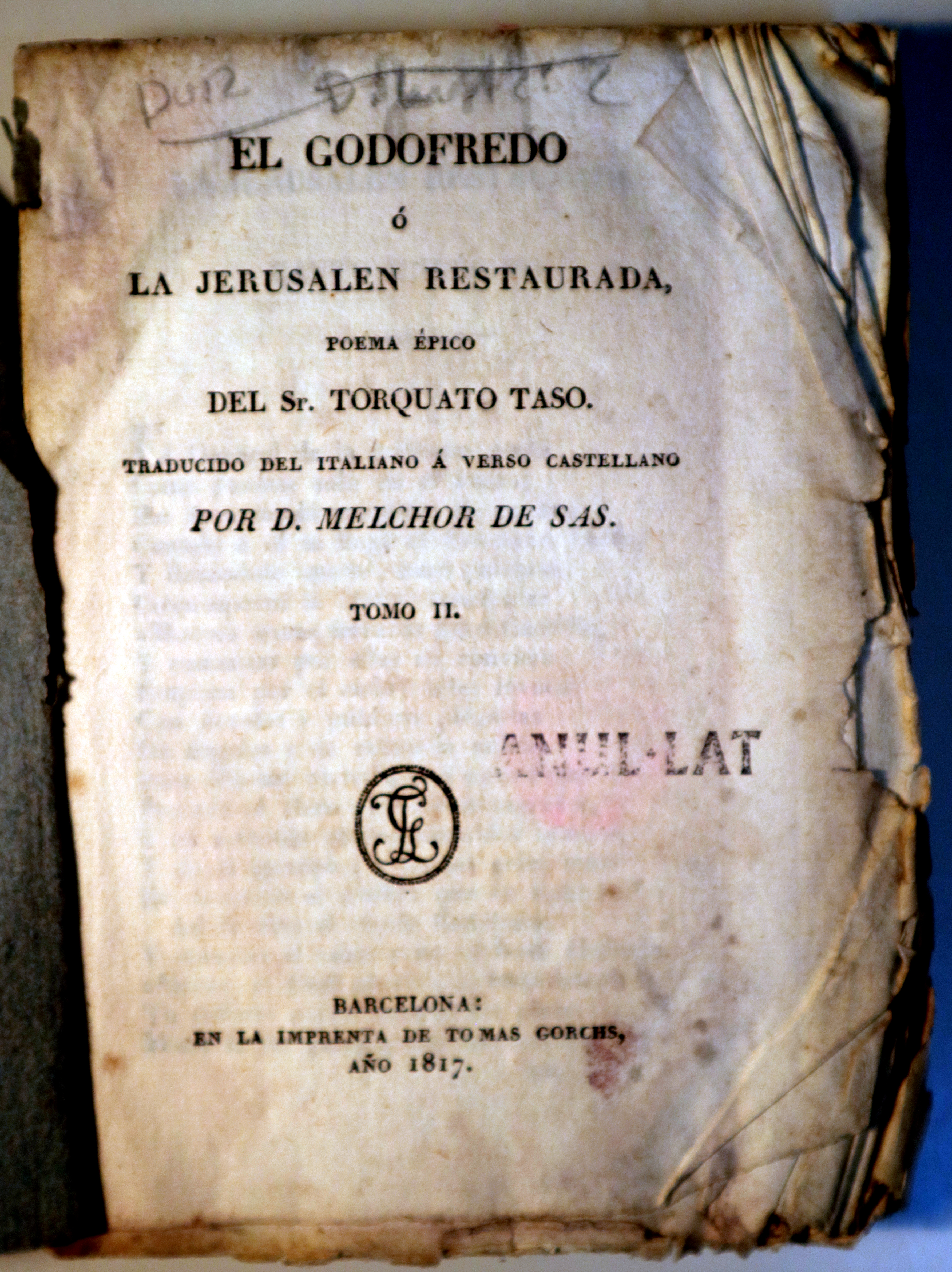Barcelona, Imprenta de Tomás Gorchs, 1817. Poema épico del Sr. Torquato Taso traducido del italiano á verso castellano por D, Melchor de Sas. Tomo I. XVII p. (Vida del Sr. Torquato Taso) + 266 p. 8º menor. Pasta española con algunos roces. Guardas decoradas. Tomo II: 265 p. Cubiertas en papel mudas. Buen ejemplar.