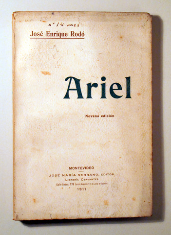 Montevideo, José María Serrano Editor, 1911. Contiene una lámina fuera del texto con una fotografía de su autor en la contraportada. Con prólogo de Leopoldo Alas, Clarín. 127 p. 8º. Rústica editorial. Inscripción del antiguo propietario en la cubierta. Desgaste que no dificulta la lectura. Buen ejemplar. Ariel es un ensayo publicado por el escritor uruguayo José Enrique Rodó en 1900, considerado como una de las obras de mayor influencia en el campo de la cultura y la política latinoamericanas, al igual que Caliban (1878) de Ernest Renan y los postulados modernistas de Rubén Darío. Es un texto breve compuesto de seis partes. Se caracteriza por su contenido filosófico y su tono pedagógico. Está dirigido principalmente a la juventud hispanoamericana, como señala el autor, para advertirles contra el utilitarismo y contra lo que él llama la nordomanía. Utiliza los personajes de La tempestad, de William Shakespeare: Próspero, Ariel y Calibán.