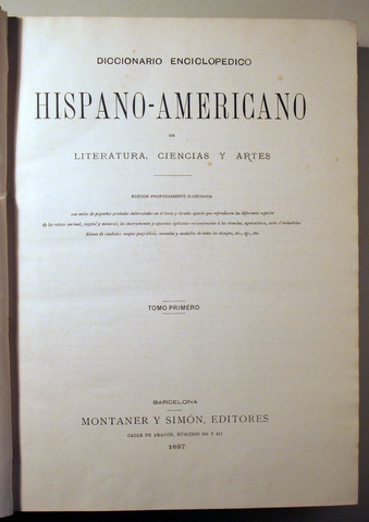 Barcelona, Montaner y Simón Editores, 1888. Tomo tercero. B-BYZ. Edición profusamente ilustrada. Tela editorial estampada algo rozada. Puntos de óxido en algunas hojas. Gran folio. Muy buen ejemplar. El Diccionario enciclopédico hispano-americano de literatura, ciencias y artes, publicado entre 1887 y 1899 por la editorial Montaner y Simón de Barcelona, es una las principales obras enciclopédicas en español del siglo xix. Tiene un total de 25 tomos, en 26 volúmenes.