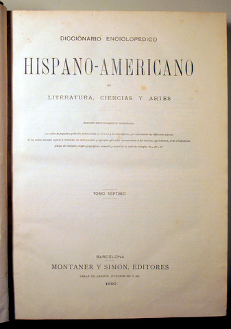 Barcelona, Montaner y Simón Editores, 1890. Tomo séptimo de la obra. E-EZZ. Edición profusamente ilustrada. Tela editorial estampada, algo rozada. Interior en buen estado. Buen ejemplar. El Diccionario enciclopédico hispano-americano de literatura, ciencias y artes, publicado entre 1887 y 1899 por la editorial Montaner y Simón de Barcelona, es una las principales obras enciclopédicas en español del siglo xix. Tiene un total de 25 tomos, en 26 volúmenes.
