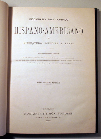 Barcelona, Montaner y Simón Editores, 1898. Tomo Vigésimo tercero de la obra.W-ZYR. Edición profusamente ilustrada. Tela editorial estampada, levemente rozado. Buen ejemplar. El Diccionario enciclopédico hispano-americano de literatura, ciencias y artes, publicado entre 1887 y 1899 por la editorial Montaner y Simón de Barcelona, es una las principales obras enciclopédicas en español del siglo xix. Tiene un total de 25 tomos, en 26 volúmenes.