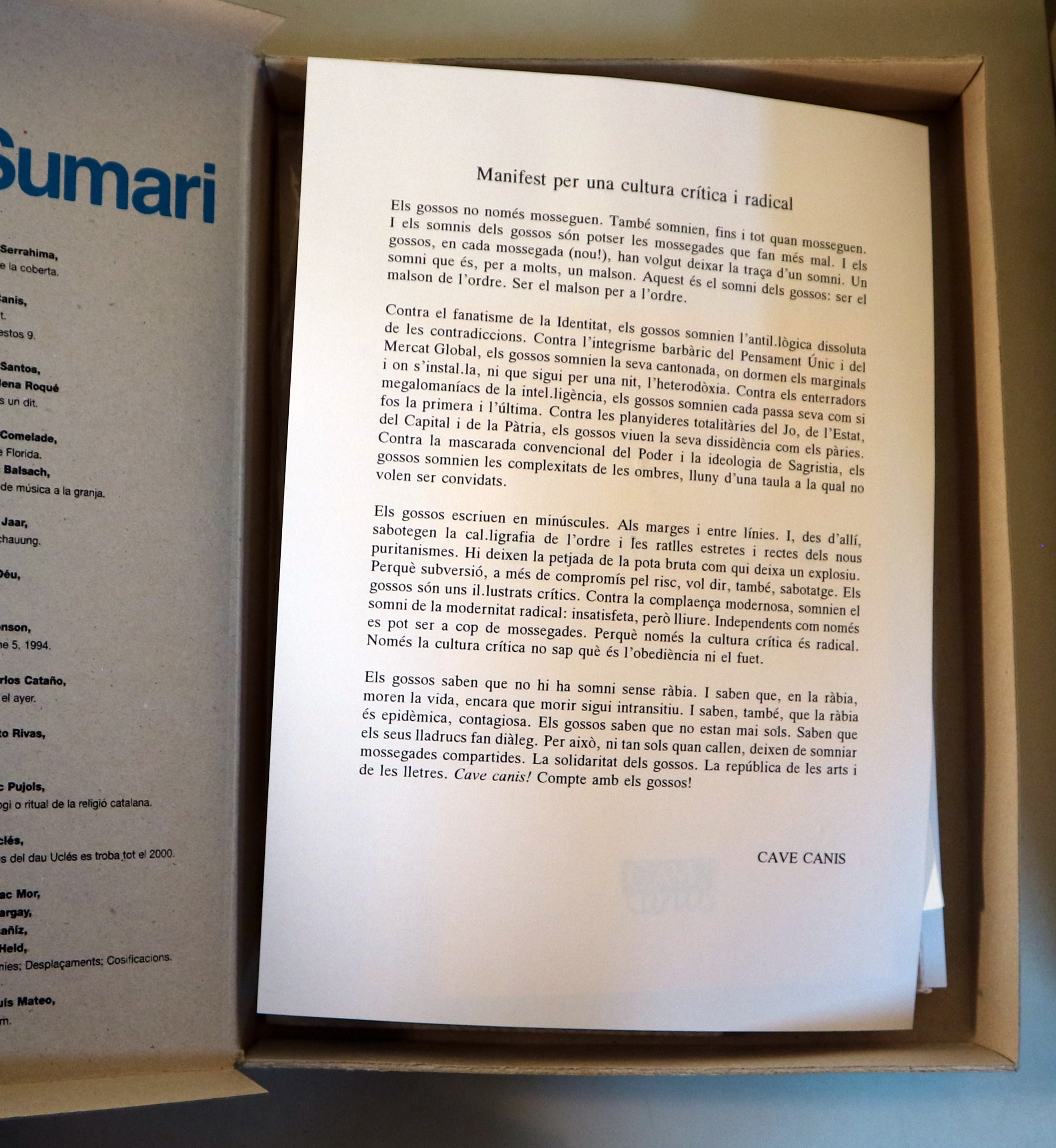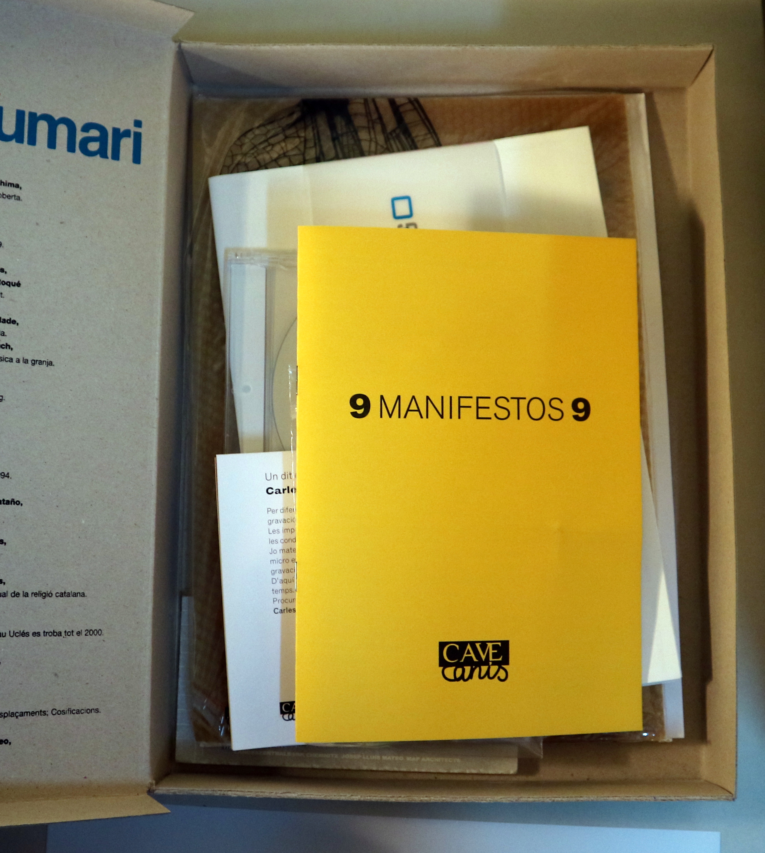 Barcelona, Cave Canis, 1999. Nombroses il·lustracions i objectes en color. Dit i disc de Carles Santos. Foto Humberto Rivas. DVD. Complet. Tancat en una caixa de Cartómida foli, amb la punta superior un pèl gastada. Interior perfecte. Bon exemplar.
