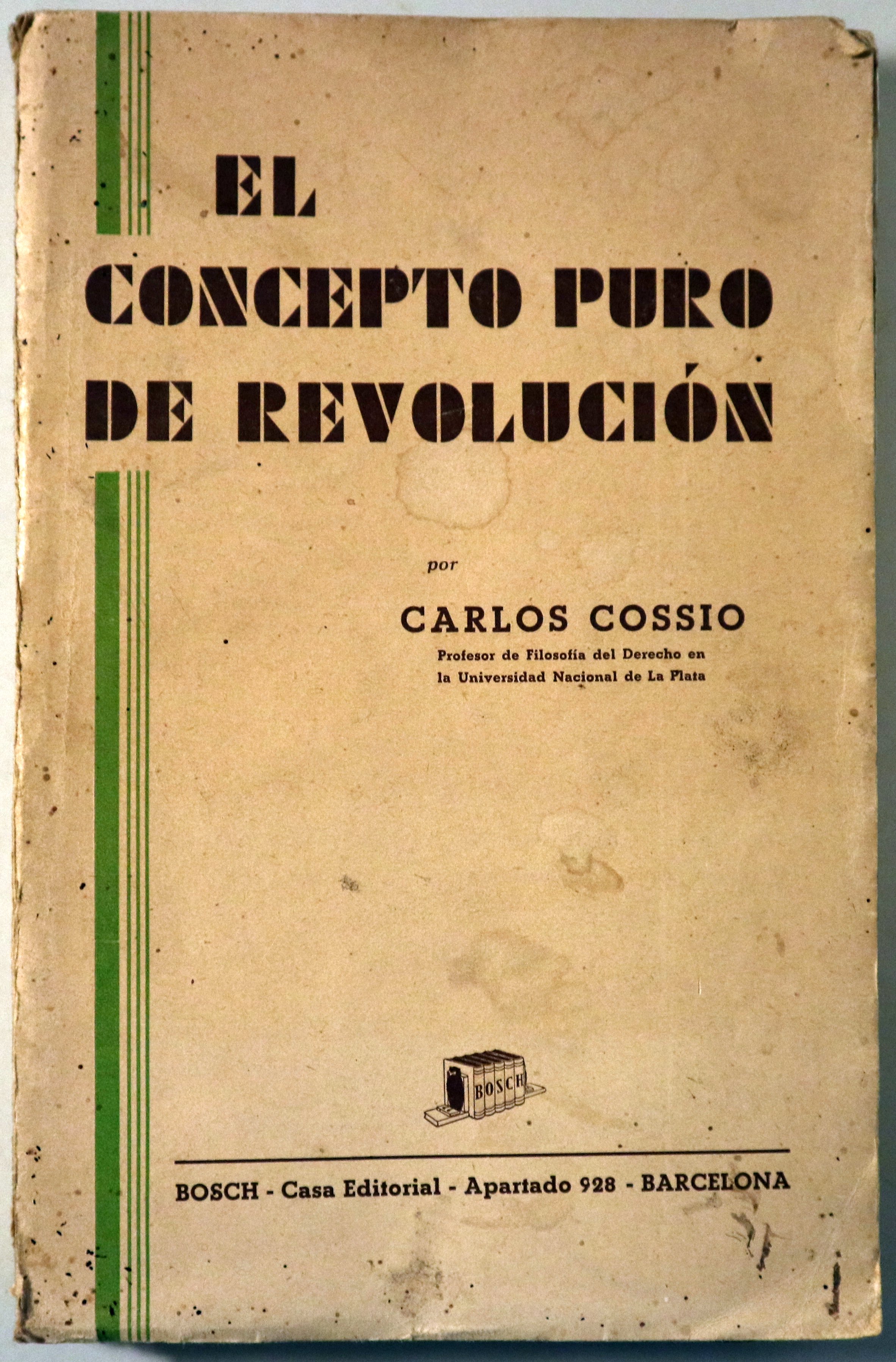 Barcelona, Bosch Casa Editorial, 1936. 223 p. 4º menor. Rústica editorial tipográfica. Inscripción del antiguo propietario. Algunas manchas. Un poco desgastado. Buen ejemplar. 1ª edición. 1st edition. "El concepto puro de revolución" es un libro de 1936 del jurista argentino Carlos Cossio donde analiza el concepto de revolución desde una perspectiva filosófica y sociológica, diferenciando su aplicación histórica de la revolución como categoría del conocimiento histórico. En este trabajo, Cossio clasifica las revoluciones y aplica su Teoría Egológica, la cual establece el derecho como conducta humana en interferencia intersubjetiva, para comprender la naturaleza de las revoluciones.
